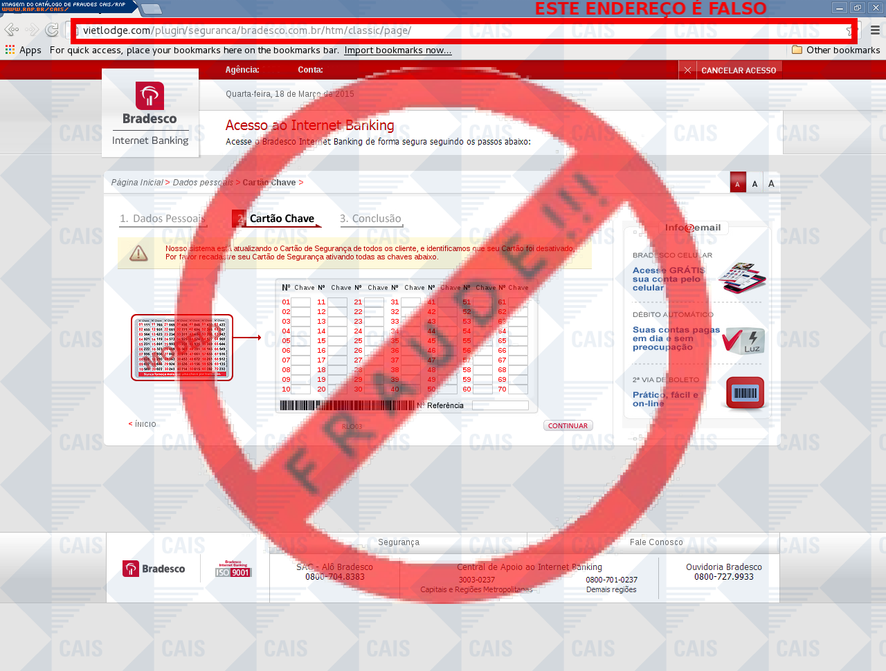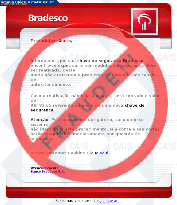 | comentário | O usuário recebe um e-mail informando que sua chave de segurança da conta do banco Bradesco expirou sendo necessário realizar uma atualização no link disponibilizado, entretanto a página fornecida é falsa criada para roubar os dados bancários da vítima. | |