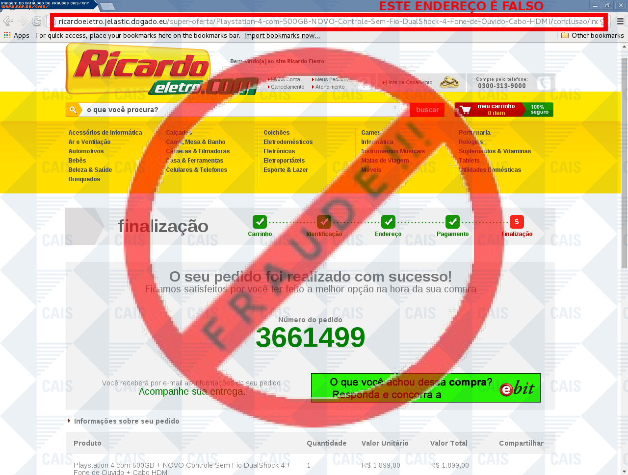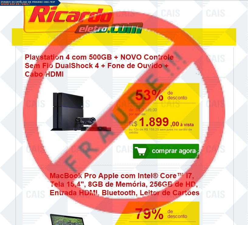 | comentário | A vítima recebe um e-mail informando sobre promoções no site de compra da Ricardo Eletro disponibilizando link de vários produtos em desconto, no entanto a página é falsa destinada a roubar as informações pessoais e do cartão do usuário. | |