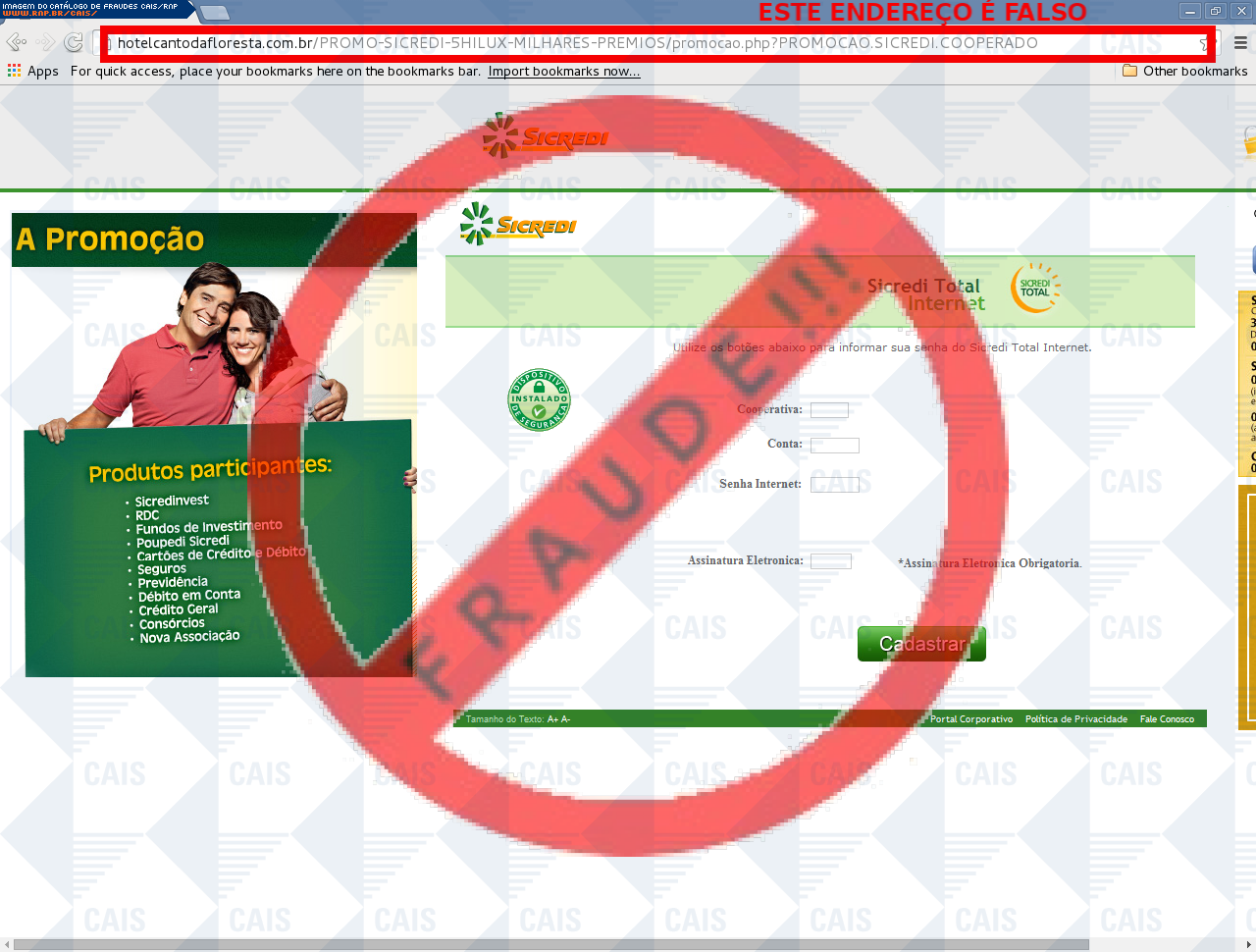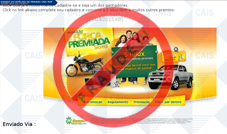 | comentário | A vítima recebe um e-mail informando sobre uma promoção relacionada a sua conta no SICREDI sendo necessário realizar um cadastro, no entanto a página é falsa destinada a roubar as informações bancárias do usuário. | |