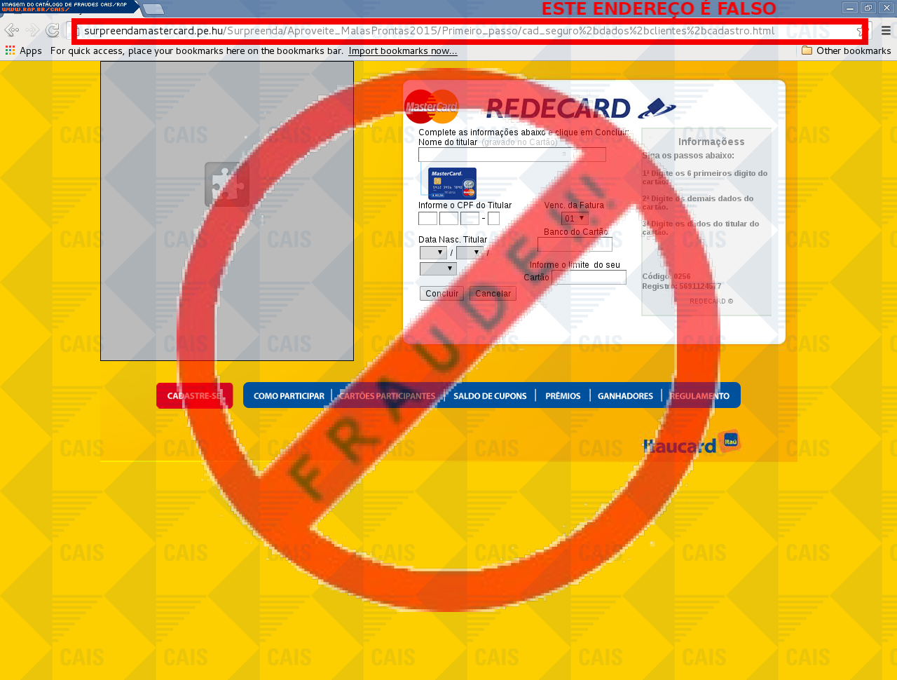 | comentário | A vítima recebe um e-mail informando sobre as vantagens da promoção Surpreenda do cartão Mastercard sendo o cadastro através do link disponibilizado, no entanto a página é falsa criada para roubar informações do usuário. | |