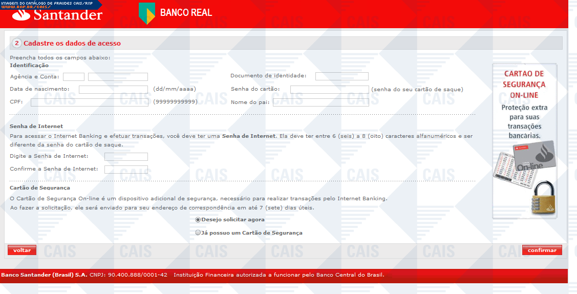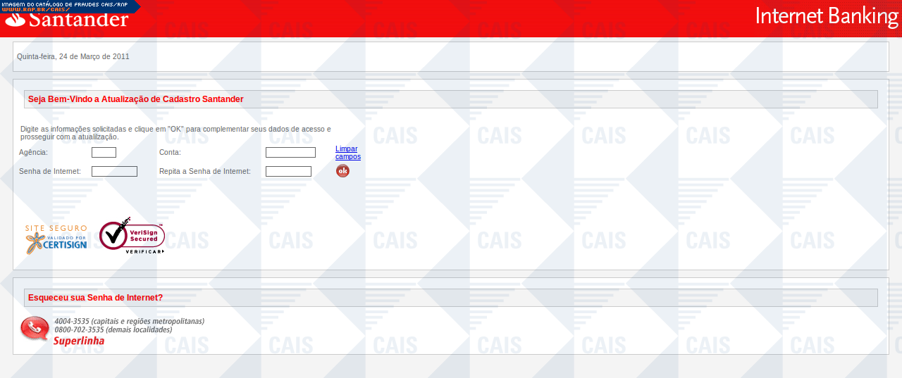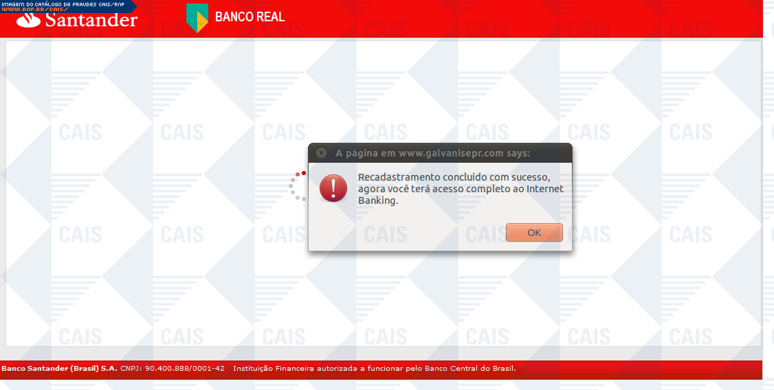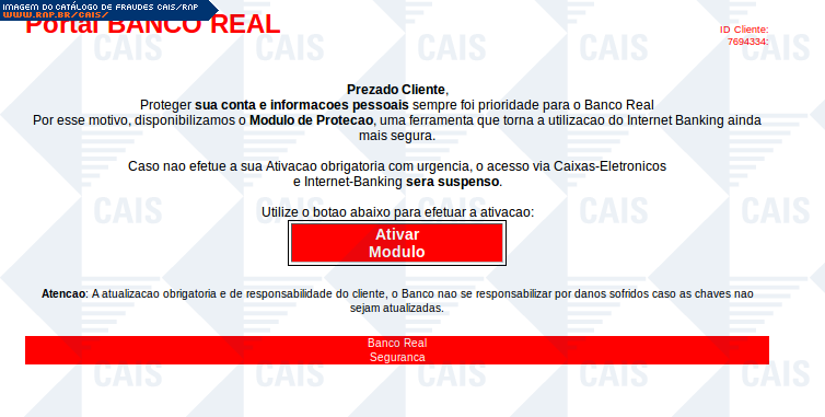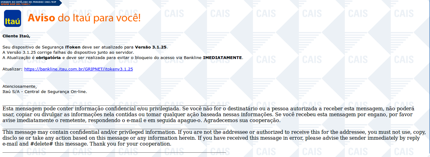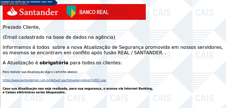 Esta página tem função informativa e educativa. Exibe uma coleção de imagens de phishing scam (fraudes eletrônicas) ou malware (código malicioso) veiculados por meio de spam (e-mail não-solicitado). Trata-se de conteúdo exemplificativo, não exaustivo, uma vez que não é possível contemplar todos os casos de fraudes existentes. Assim, caso você tenha conhecimento de um exemplar que não esteja aqui presente, isto não significa que não seja válido ou real. Inclusive incentivamos que você o envie para análise do CAIS para que, se for o caso, passe a integrar o nosso acervo.