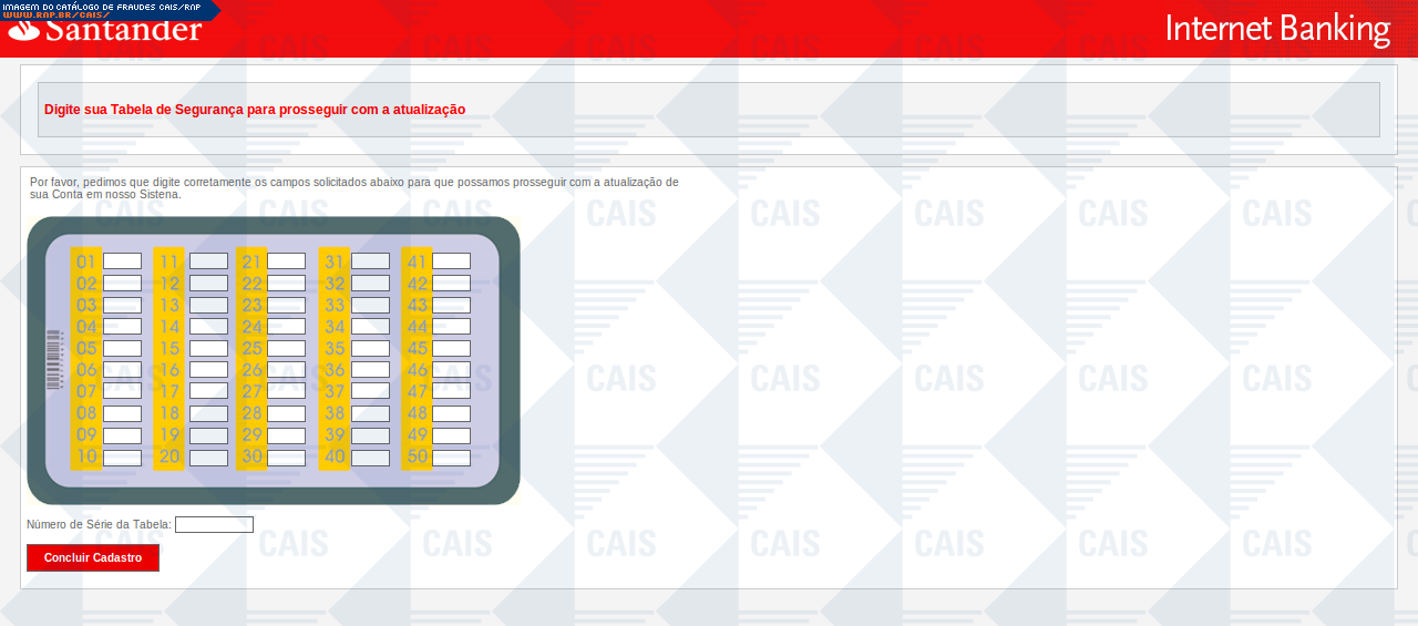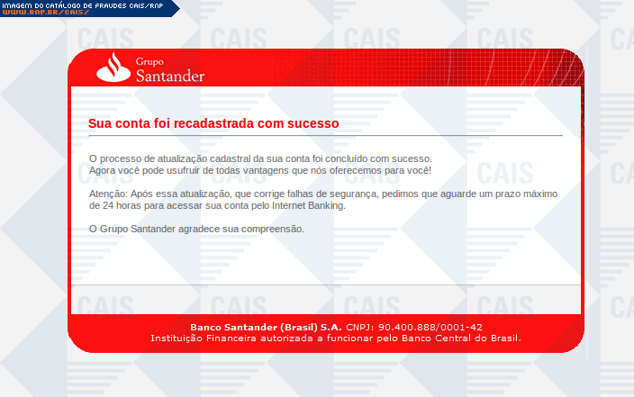 | comentário | Mensagem falsa do Grupo Santander solicitando que a vítima efetue uma atualização de segurança obrigatória. O link contido na mensagem leva a uma página falsa destinada a coletar informações sobre a conta bancária da vítima. | |
