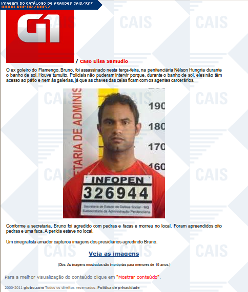 | comentário | Notícia falsa do G1 informando sobre o suposto assassinato do goleiro Bruno em uma penitenciária. A fraude possui um link para supostas imagens do momento em que Bruno era agredido. O link leva ao malware Gen:Trojan.Heur.VB.cm0@dGhWW9hi (BitDefender). | |