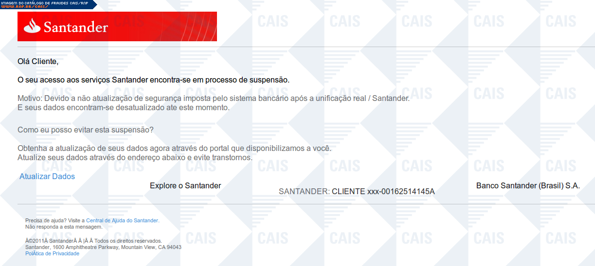| comentário | Mensagem em nome do Grupo Santander informando que a vítima teve seu acesso aos serviços do banco suspenso. A fraude fornece um link para uma suposta atualização de dados. O link leva a uma página falsa que já havia sido removida no momento da análise. | |
