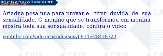 | comentário | A mensagem contém um link para um suposto vídeo com imagens da transexual do Big Brother Brasil na Playboy. O conteúdo malicioso não estava disponível no momento da análise. | |