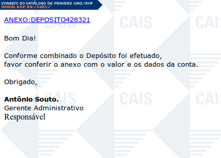 | comentário | A fraude contém um link para um suposto comprovante de depósito. O link leva a conteúdo malicioso que não estava mais disponível no momento da análise. | |