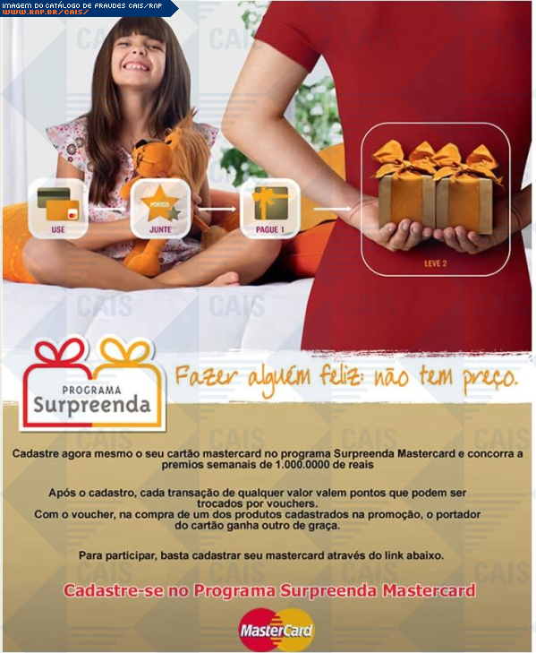 | comentário | A fraude usa o nome da Mastercard para anunciar a promoção Surpreenda. O link para o cadastro na promoção leva a uma página falsa que já havia sido removida no momento da análise. | |