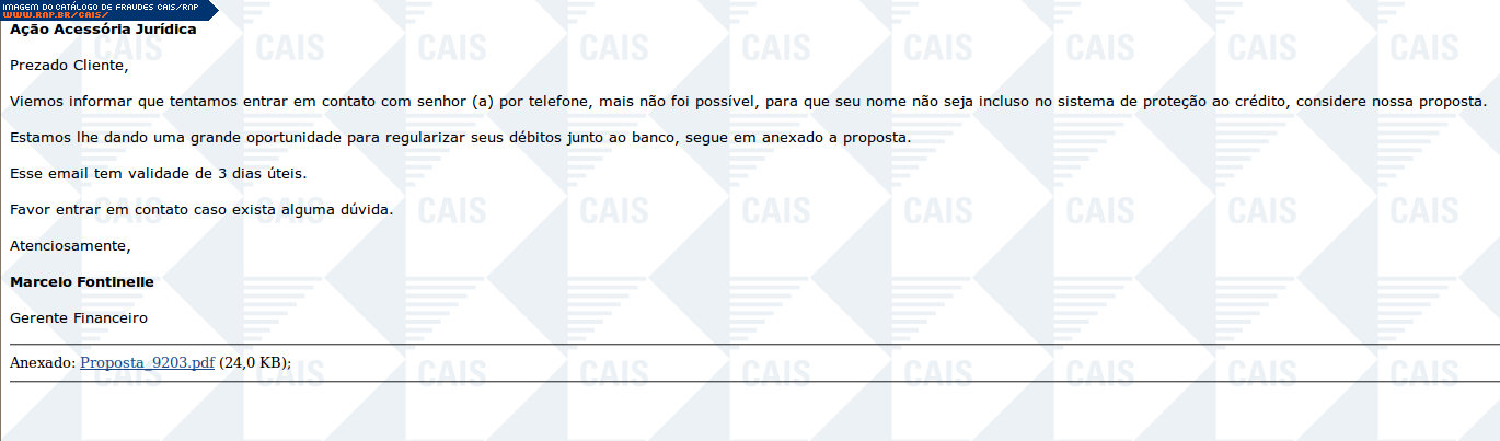 | comentário | A mensagemé em nome de um gerente financeiro que estaria enviando uma proposta para que a vitima possa negociar o pagamento de uma dívida. O link leva a um arquivo malicioso que foi identificado como Packed_TheMida.B (Norman). | |