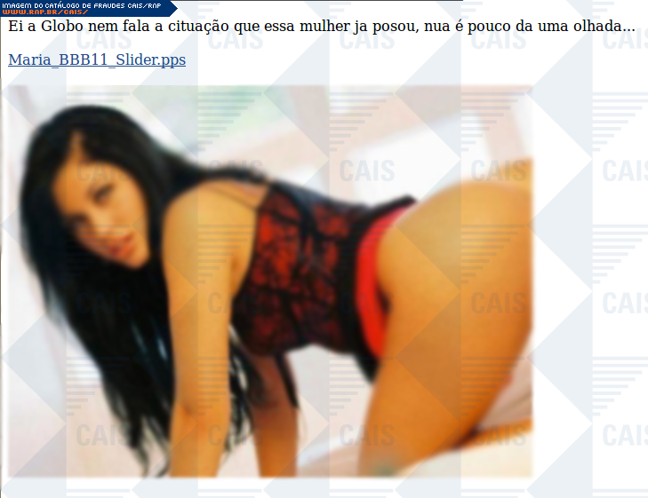 | comentário | A fraude contém um link para supostas fotos nuas de uma participante do Big Brother Brasil. O link leva a contúdo malicioso que não estava disponível no momento da análise. | |