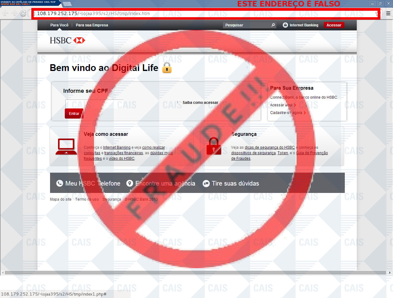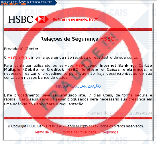 | comentário | A vítima recebe uma mensagem informando que sua conta no banco HSBC esta com o cadastro desatualizado sendo necessário realiza-lo no link disponibilizado, no entanto a página é falsa destinada a roubar as informações bancárias do usuário. | |