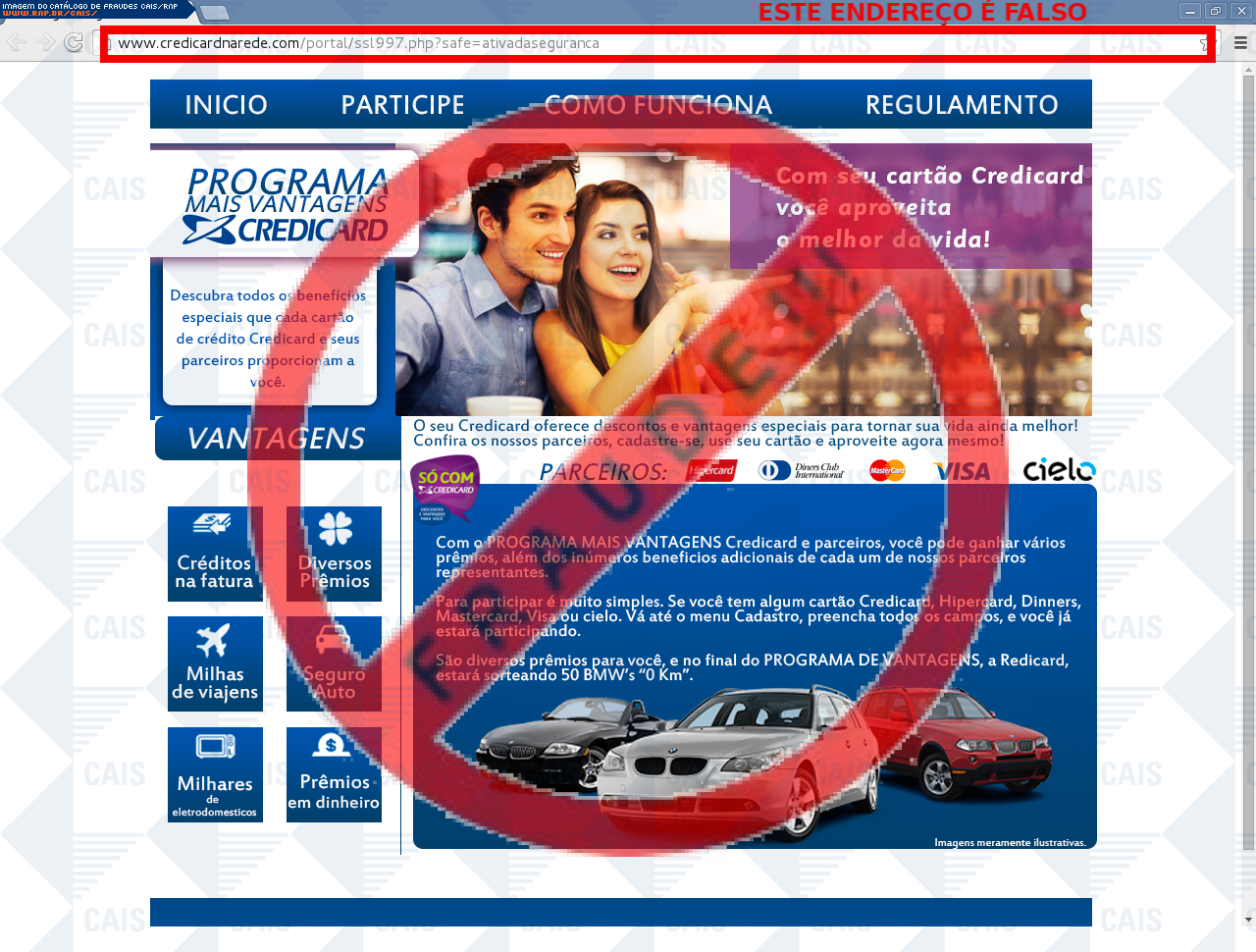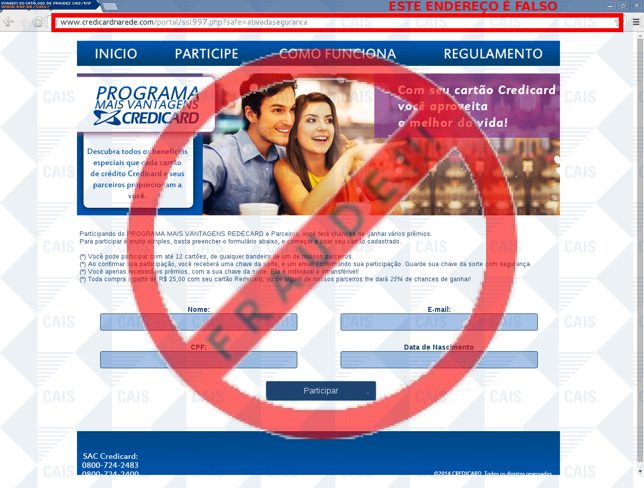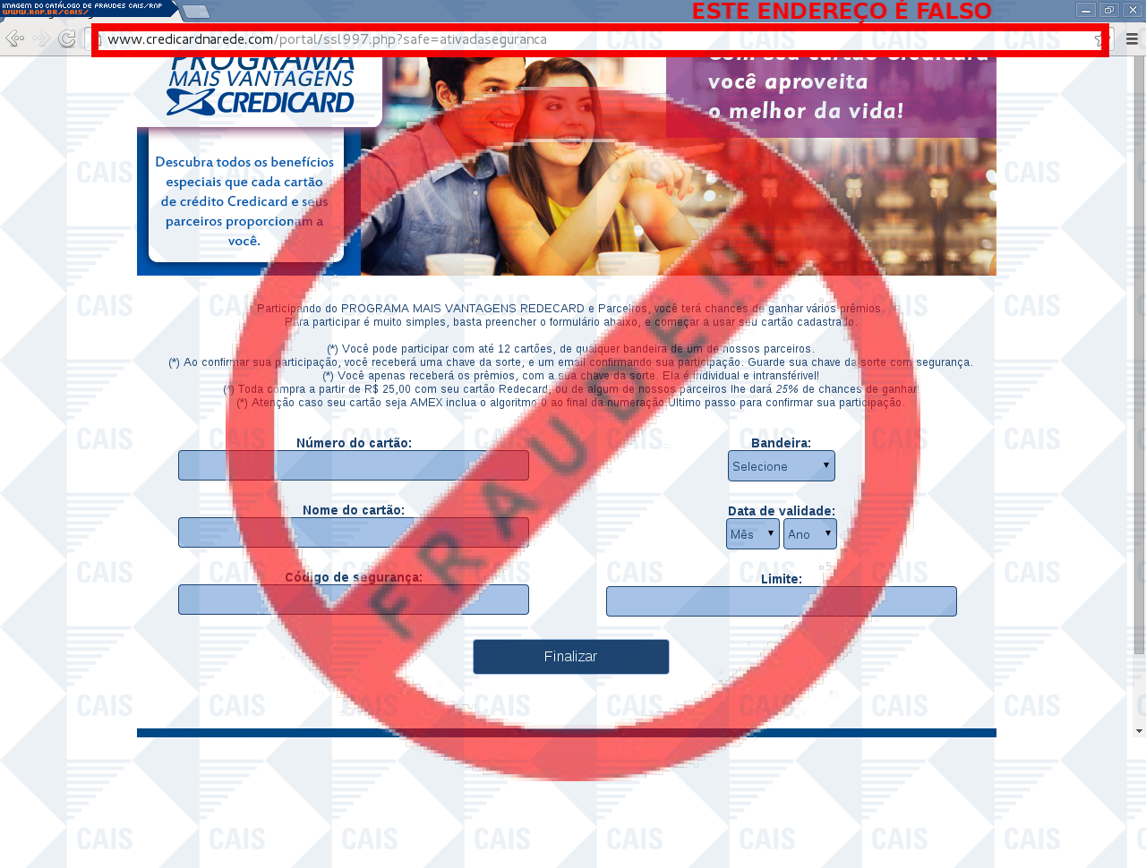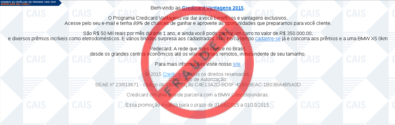 | comentário | A vítima recebe um e-mail informando sobre as vantagens da promoção Credicard Vantagens do cartão Credicard sendo o cadastro através do link disponibilizado, no entanto a página é falsa criada para roubar informações do usuário. | |