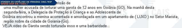 | comentário | Nesta fraude a mensagem faz referência ao caso de tortura identificado na cidade de Goiânia e que foi destaque na mídia. O suposto vídeo da garota sendo torturada é um link para o arquivo include.video.exe que foi identificado por antivirus como Trojan.DownLoader.... (leia mais) | |