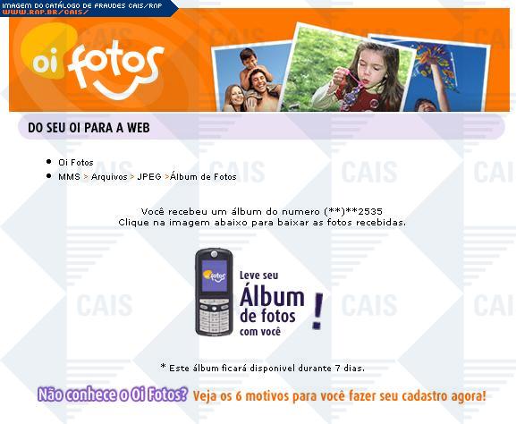| comentário | Nesta fraude que utiliza o nome da operadora Oi temos uma mensagem que indica o recebimento de um álbum de fotos do número (**)**2535. O link disponivel para o arquivo malicioso foi removido pelo site que hospedava o arquivo. Remover o arquivo do site é uma... (leia mais) | |
