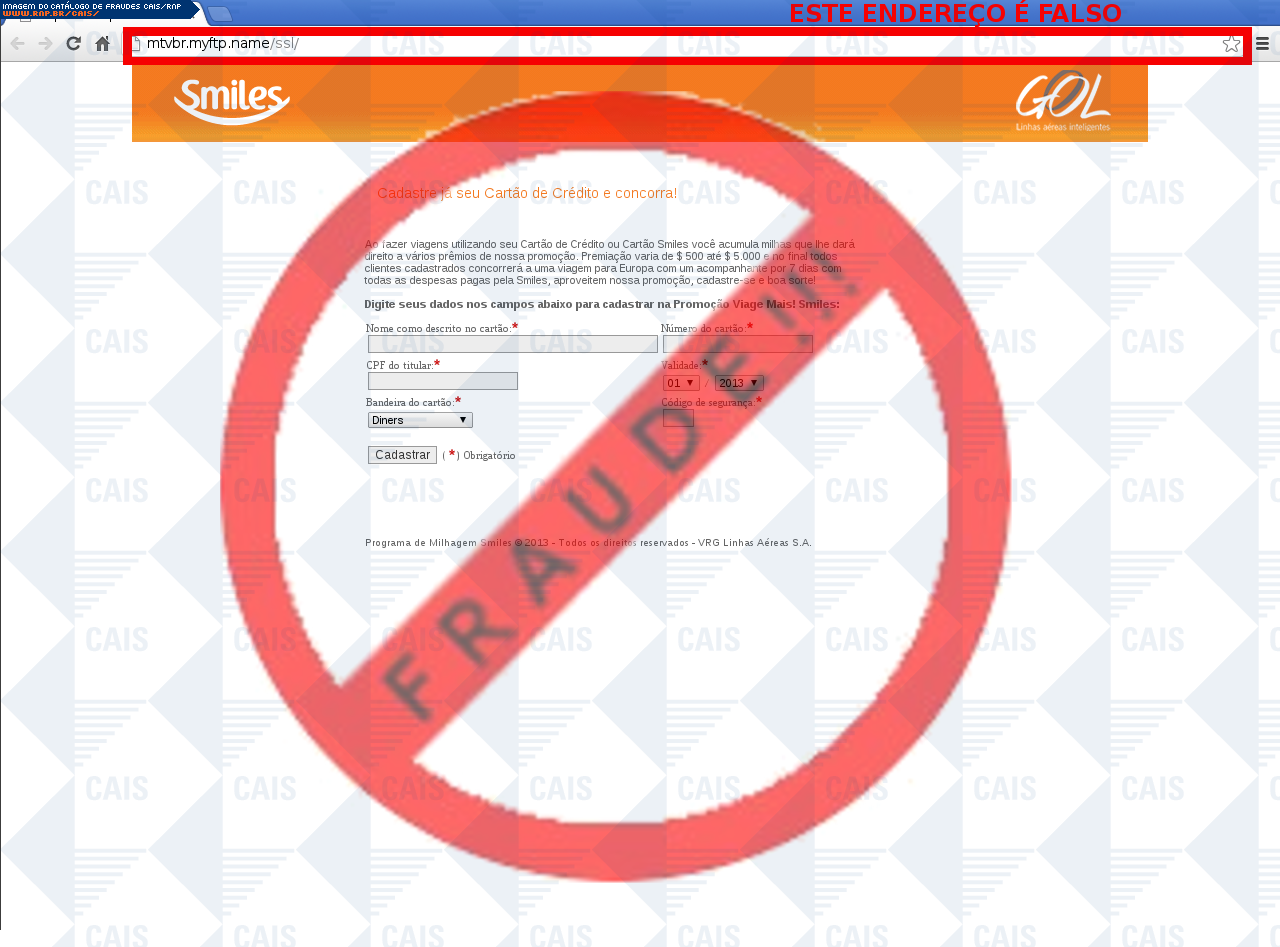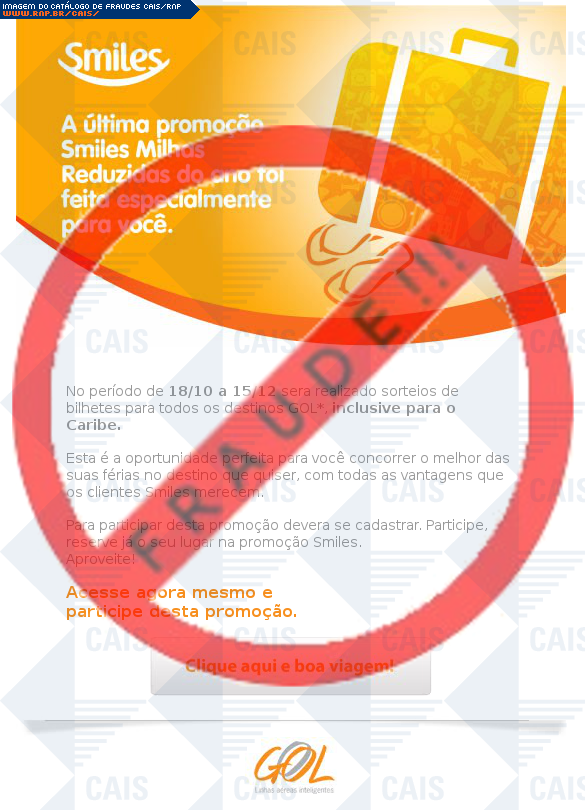 | comentário | Nessa ocorrencia o fraudador encaminha um e-mail ao usuário informando-o sobre um sorteio de uma viagem promocional e que para participar o mesmo deve cadastrar-se no site da empresa aerea, mas ao acessar o link disponivel no e-mail o usuário é levado a uma... (leia mais) | |