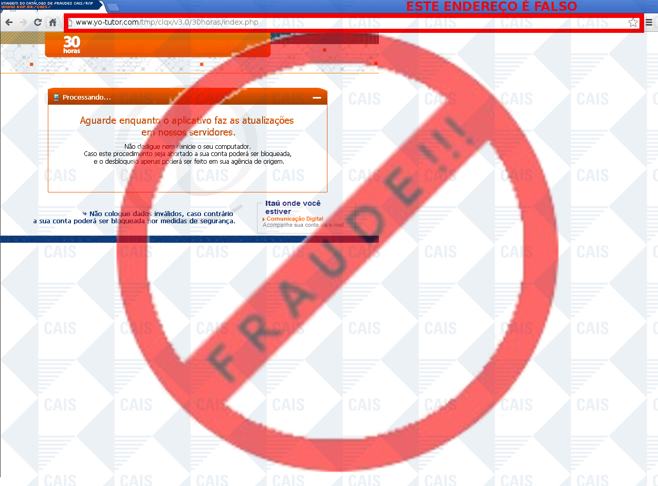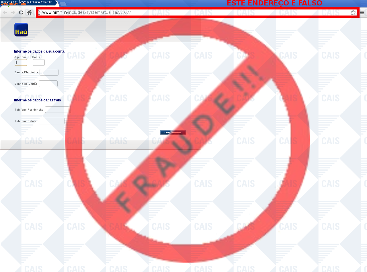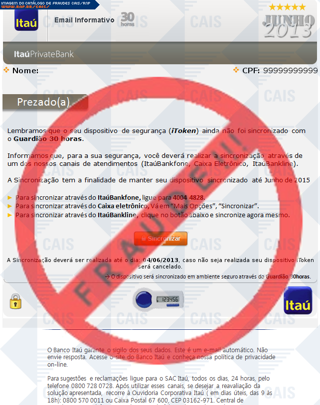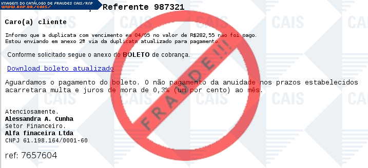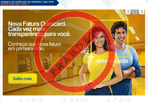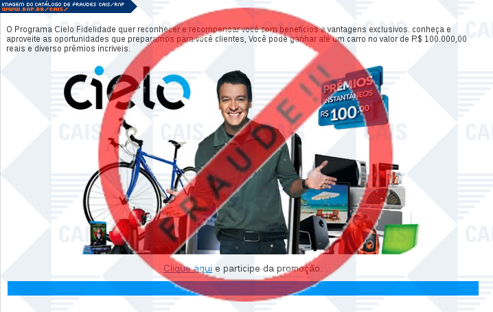 Esta página tem função informativa e educativa. Exibe uma coleção de imagens de phishing scam (fraudes eletrônicas) ou malware (código malicioso) veiculados por meio de spam (e-mail não-solicitado). Trata-se de conteúdo exemplificativo, não exaustivo, uma vez que não é possível contemplar todos os casos de fraudes existentes. Assim, caso você tenha conhecimento de um exemplar que não esteja aqui presente, isto não significa que não seja válido ou real. Inclusive incentivamos que você o envie para análise do CAIS para que, se for o caso, passe a integrar o nosso acervo.