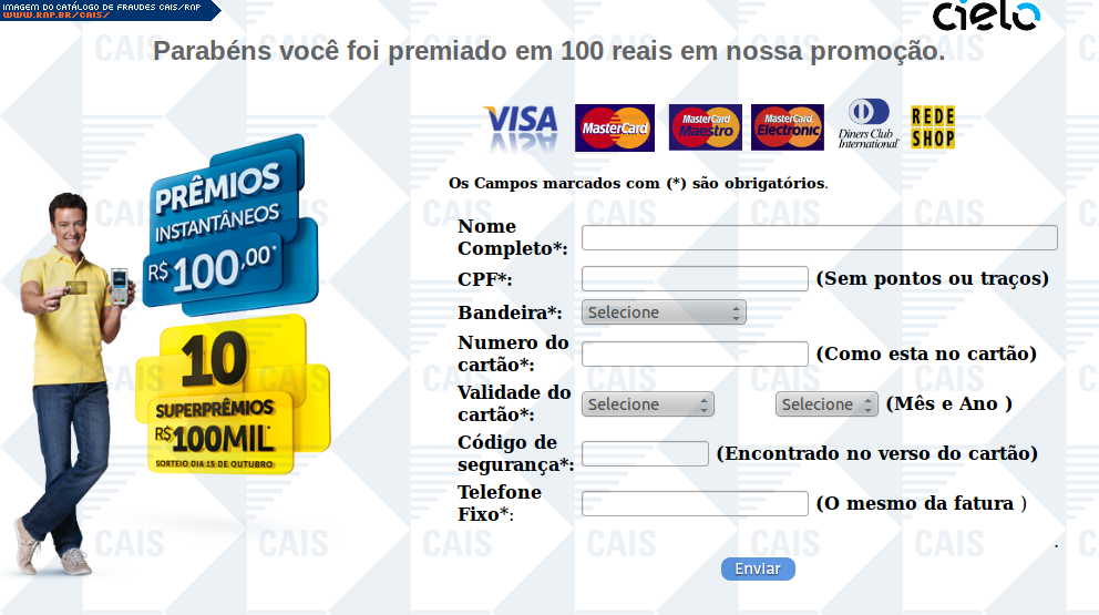 | comentário | A fraude oferece cadastro em promoção da Cielo na qual a vítima supostamente concorre a prêmios em dinheiro. Havia um link para tal cadastro, porém este apontava para uma falsa página da Cielo, na qual dados confidenciais eram solicitados. | |