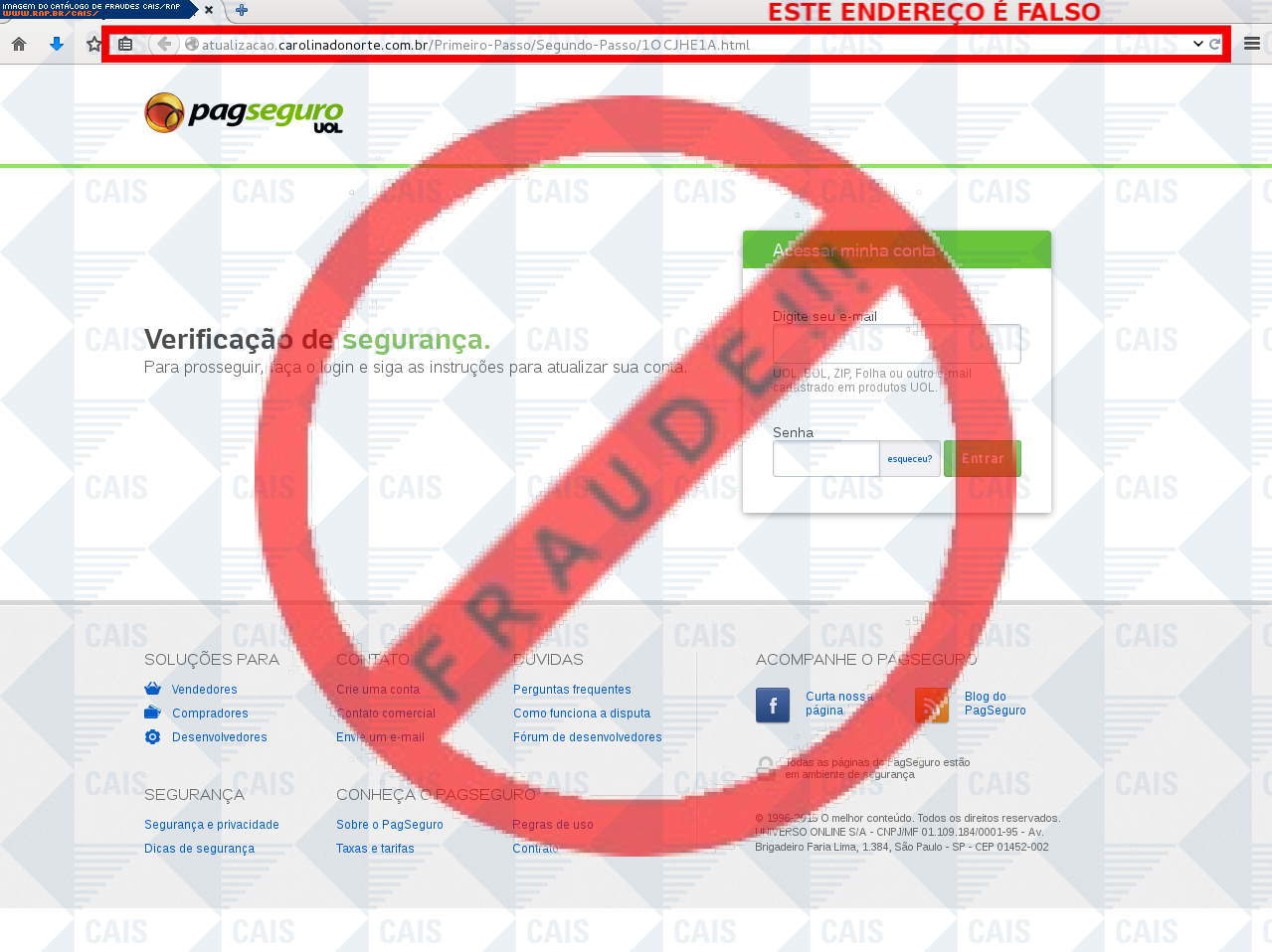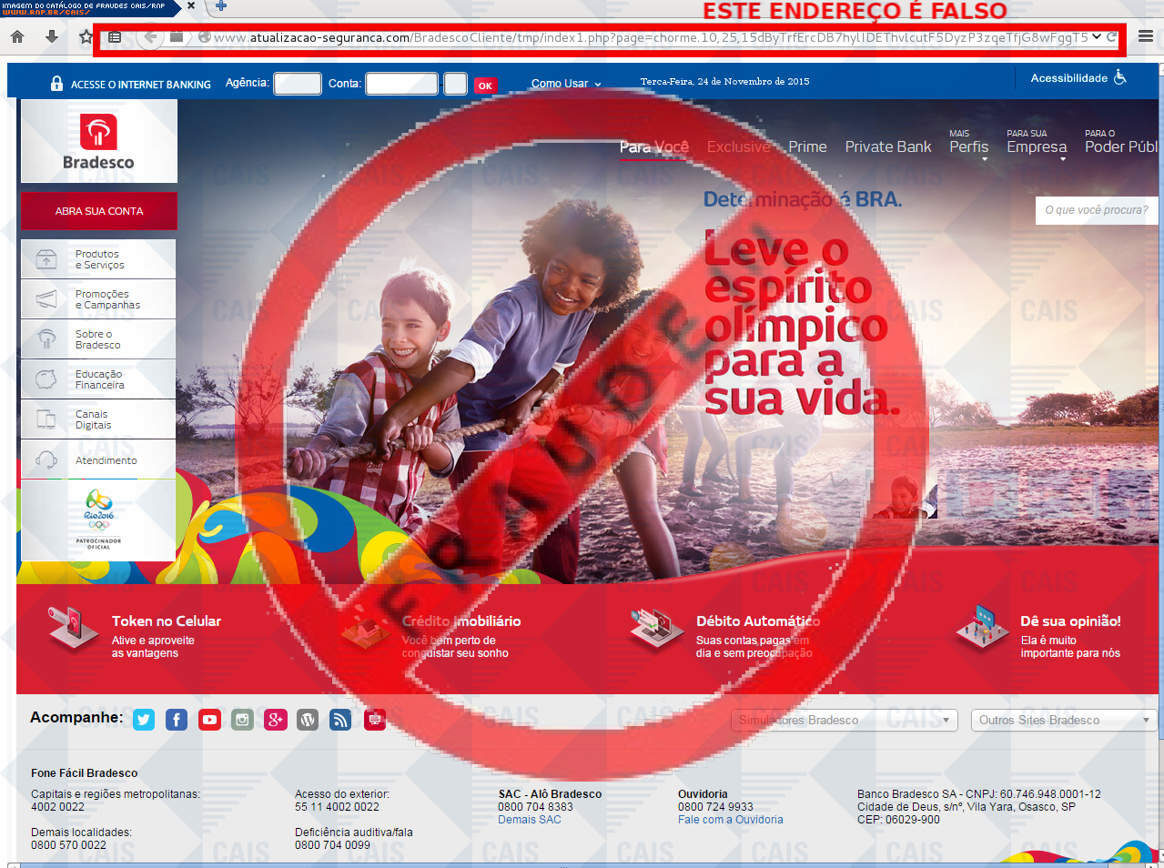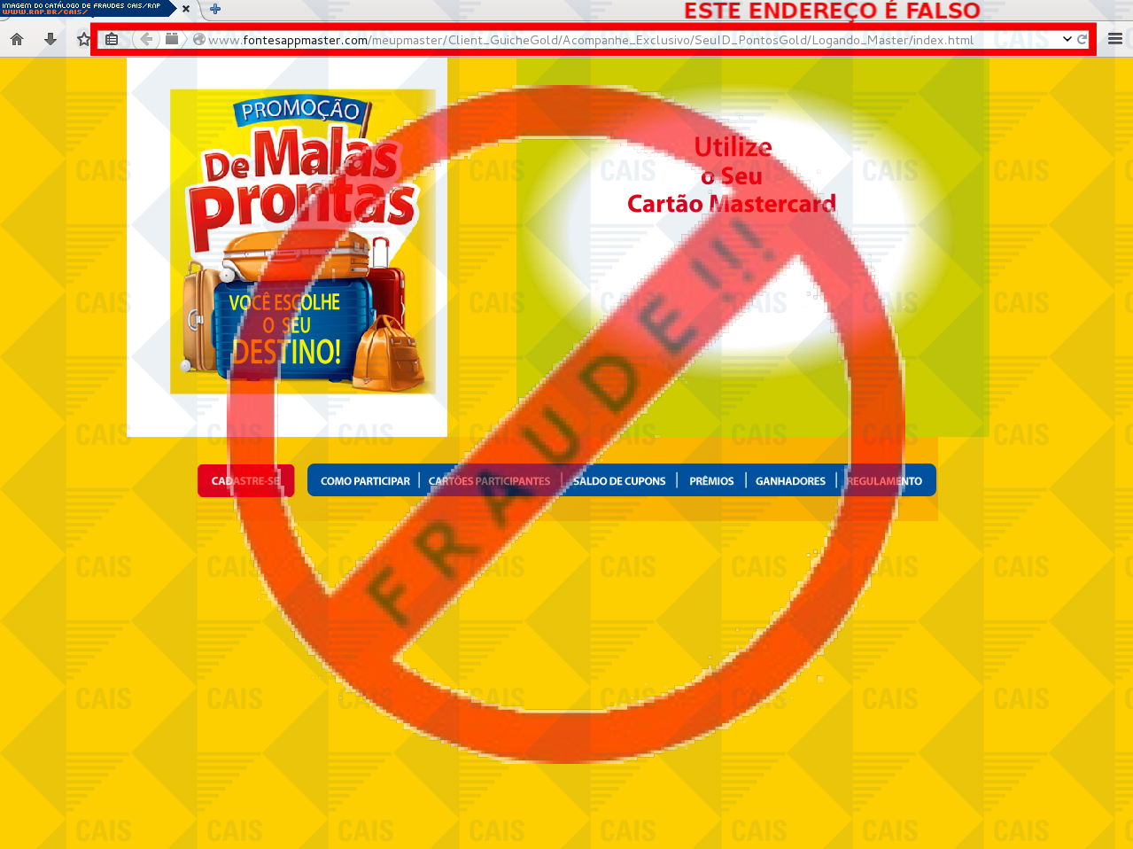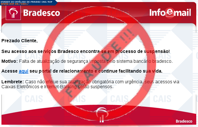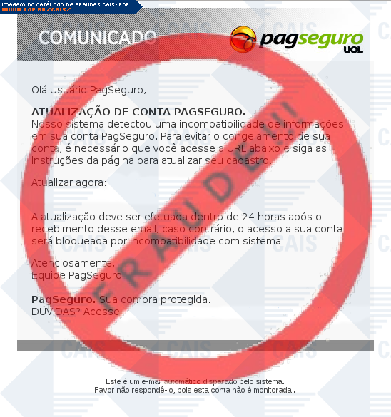 Esta página tem função informativa e educativa. Exibe uma coleção de imagens de phishing scam (fraudes eletrônicas) ou malware (código malicioso) veiculados por meio de spam (e-mail não-solicitado). Trata-se de conteúdo exemplificativo, não exaustivo, uma vez que não é possível contemplar todos os casos de fraudes existentes. Assim, caso você tenha conhecimento de um exemplar que não esteja aqui presente, isto não significa que não seja válido ou real. Inclusive incentivamos que você o envie para análise do CAIS para que, se for o caso, passe a integrar o nosso acervo.