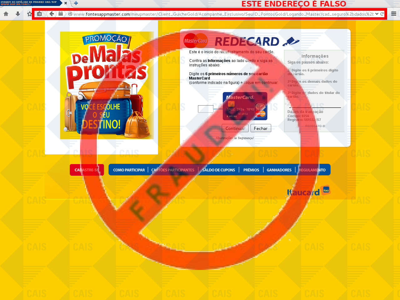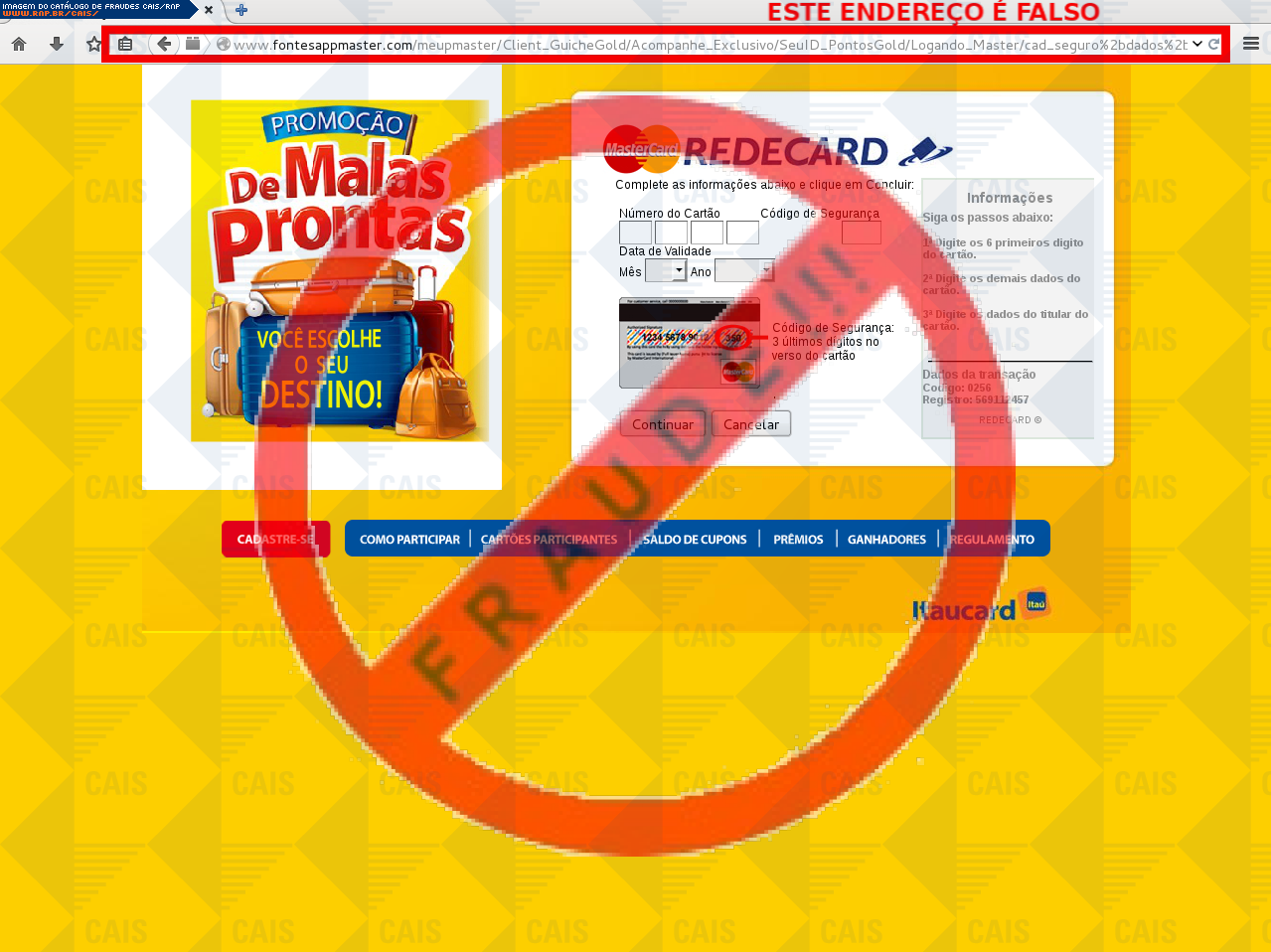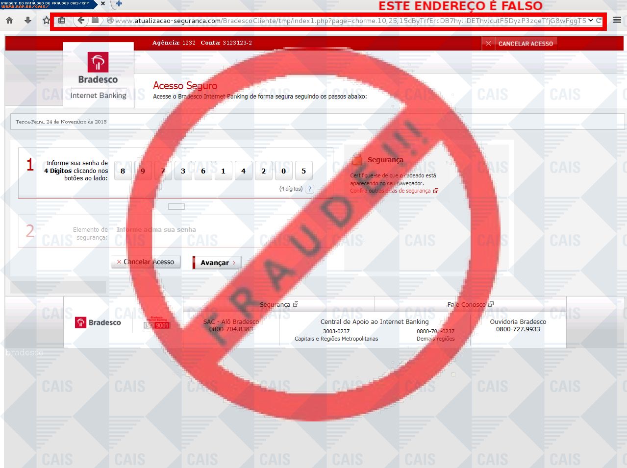 Esta página tem função informativa e educativa. Exibe uma coleção de imagens de phishing scam (fraudes eletrônicas) ou malware (código malicioso) veiculados por meio de spam (e-mail não-solicitado). Trata-se de conteúdo exemplificativo, não exaustivo, uma vez que não é possível contemplar todos os casos de fraudes existentes. Assim, caso você tenha conhecimento de um exemplar que não esteja aqui presente, isto não significa que não seja válido ou real. Inclusive incentivamos que você o envie para análise do CAIS para que, se for o caso, passe a integrar o nosso acervo.