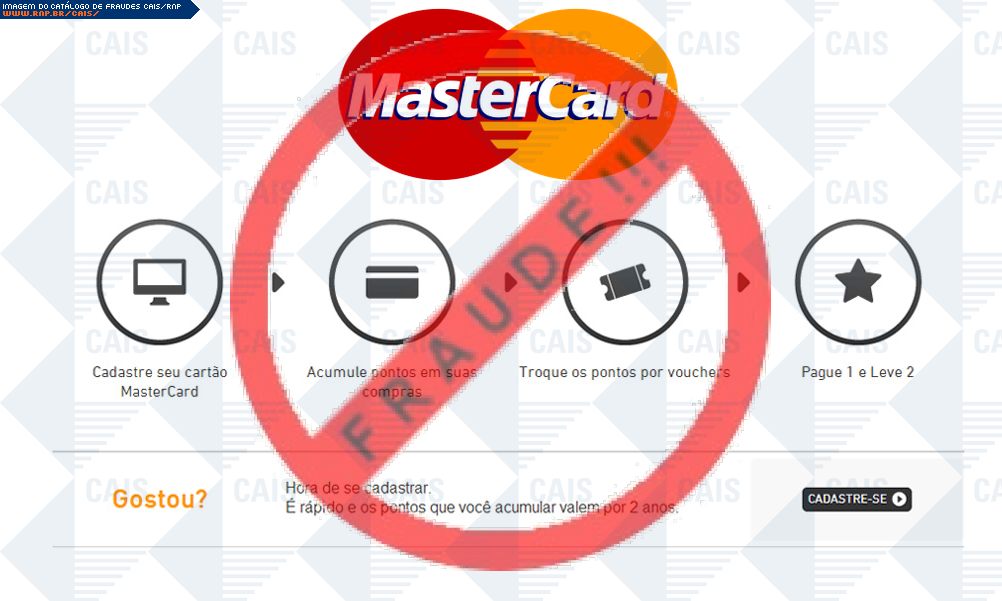 | comentário | A vítima recebe um email oferecendo cadastro em uma suposta promoção da Mastercard. Entretanto, o link na mensagem leva a um site falso que tenta roubar informações do cartão de crédito da vítima. | |