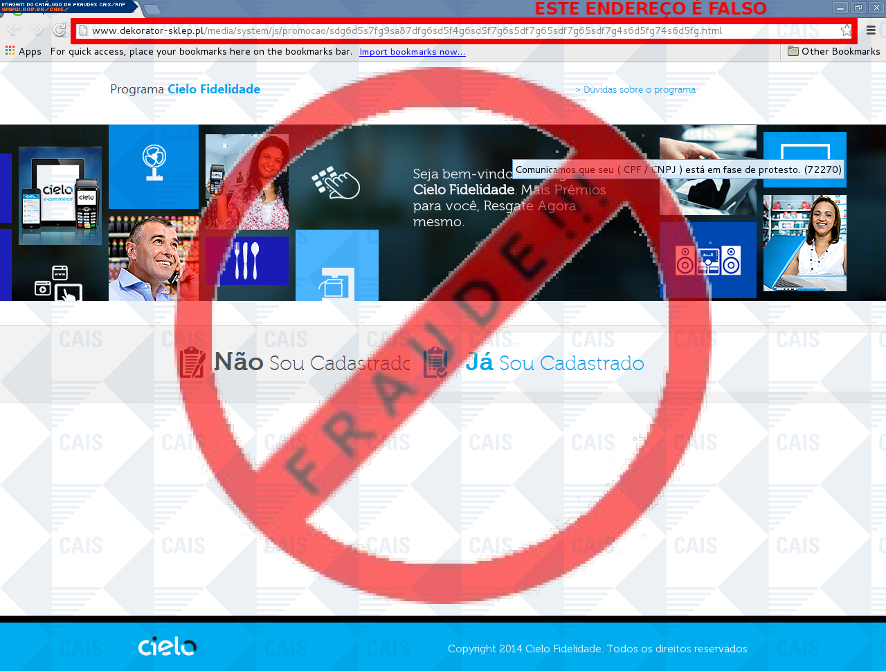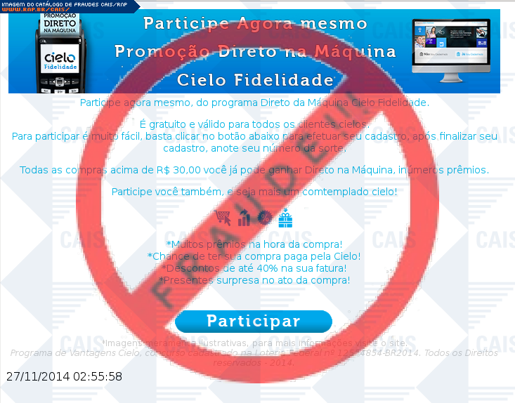| comentário | A vítima recebe um e-mail informando sobre promoções relacionados a seu cartão Cielo sendo necessário realizar um cadastro, no entanto a página é falsa destinada a roubar os dados do cartão de crédito do usuário. | |