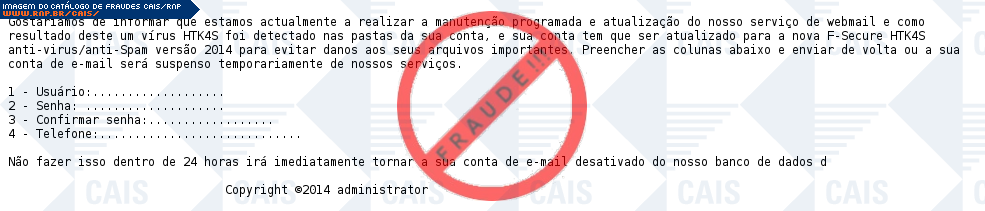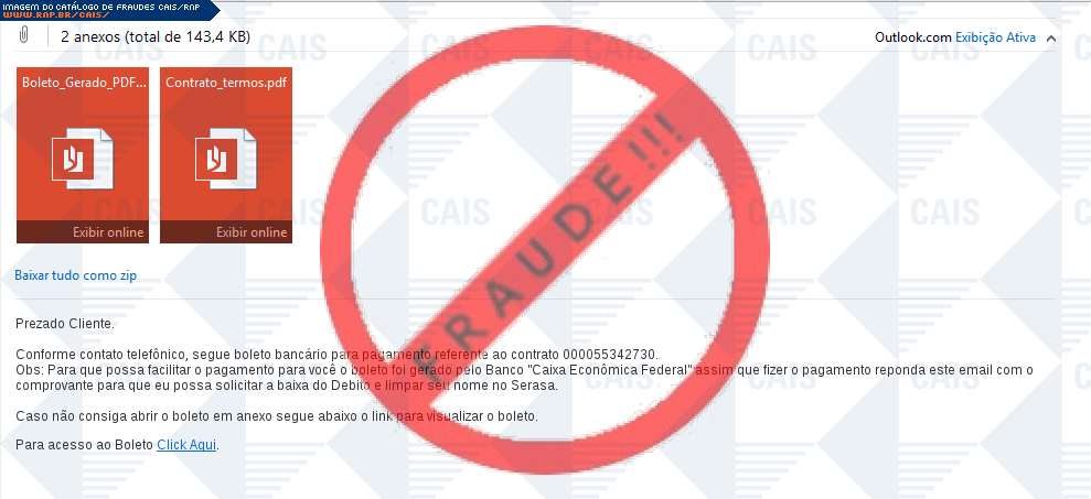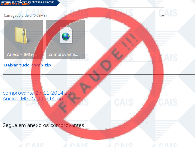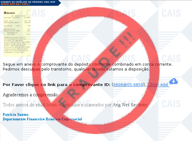 Esta página tem função informativa e educativa. Exibe uma coleção de imagens de phishing scam (fraudes eletrônicas) ou malware (código malicioso) veiculados por meio de spam (e-mail não-solicitado). Trata-se de conteúdo exemplificativo, não exaustivo, uma vez que não é possível contemplar todos os casos de fraudes existentes. Assim, caso você tenha conhecimento de um exemplar que não esteja aqui presente, isto não significa que não seja válido ou real. Inclusive incentivamos que você o envie para análise do CAIS para que, se for o caso, passe a integrar o nosso acervo.