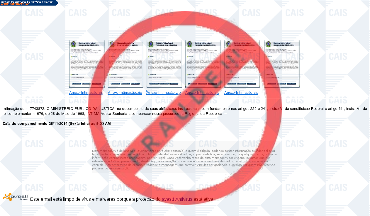 | comentário | O usuário recebe uma mensagem contendo anexos de intimação disponível para download, no entanto o arquivo originado é malicioso criado para roubar informações da vítima e instalar outros arquivos fraudulentos com o nome de Trojan/Win32.Symmi. | |