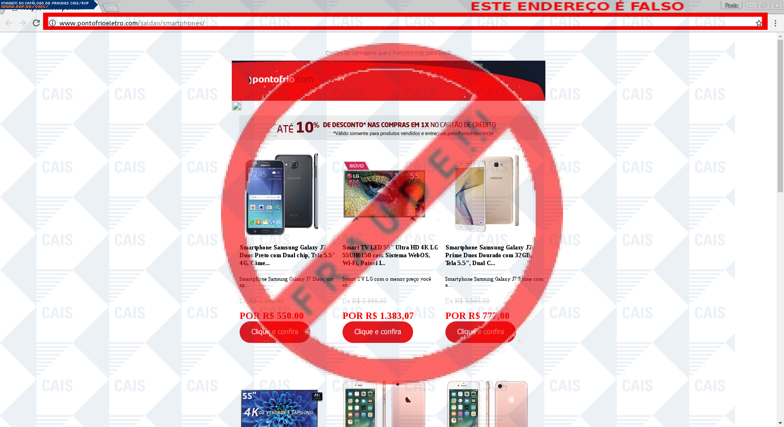 | comentário | A vítima recebe um e-mail informando sobre promoções no site de compra da Ponto Frio disponibilizando link de vários produtos em desconto, no entanto a página é falsa destinada a roubar as informações pessoais e do cartão de crédito/débito do usuário. | |