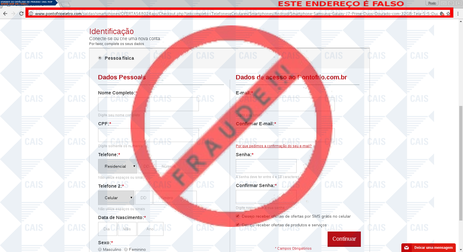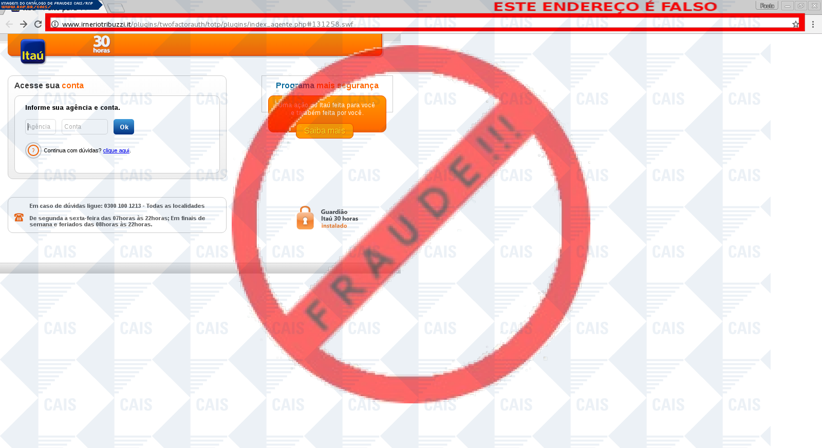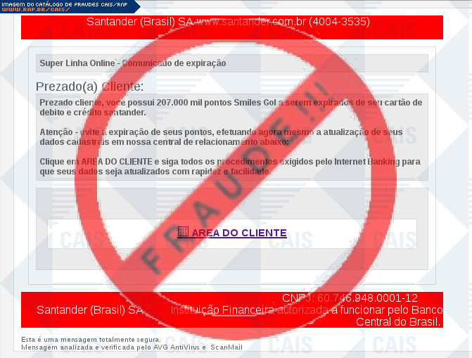Esta página tem função informativa e educativa. Exibe uma coleção de imagens de phishing scam (fraudes eletrônicas) ou malware (código malicioso) veiculados por meio de spam (e-mail não-solicitado). Trata-se de conteúdo exemplificativo, não exaustivo, uma vez que não é possível contemplar todos os casos de fraudes existentes. Assim, caso você tenha conhecimento de um exemplar que não esteja aqui presente, isto não significa que não seja válido ou real. Inclusive incentivamos que você o envie para análise do CAIS para que, se for o caso, passe a integrar o nosso acervo.