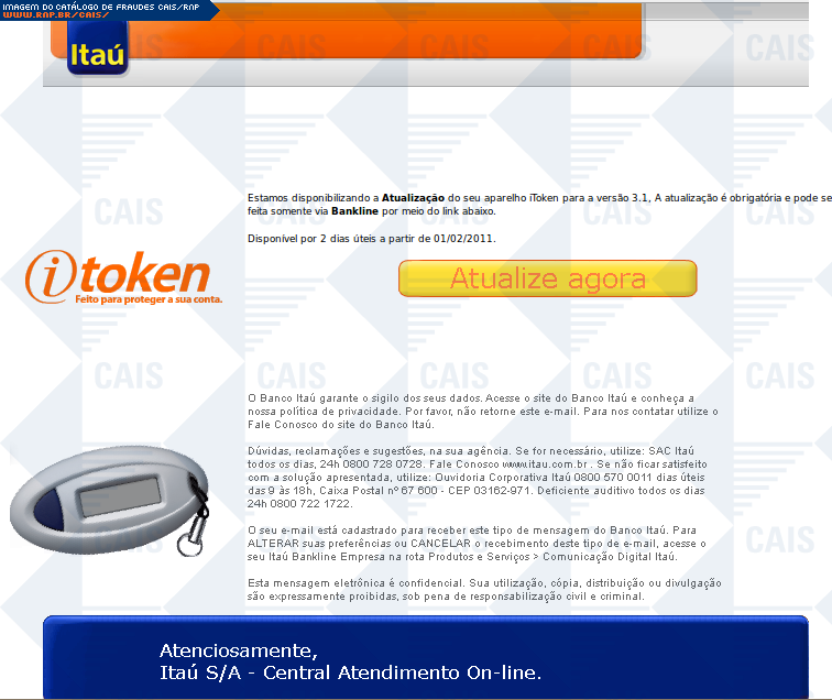 | comentário | Fraude que informa que o cliente deve efetuar uma atualização do aparelho iToken para uma versão mais nova (3.1). O link para atualização direciona para um código malicioso identificado como: Win32:Malware-gen (Avast). | |