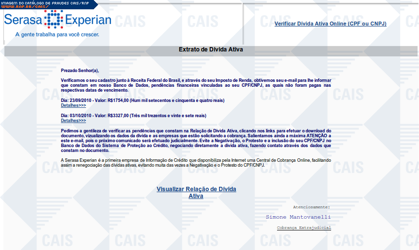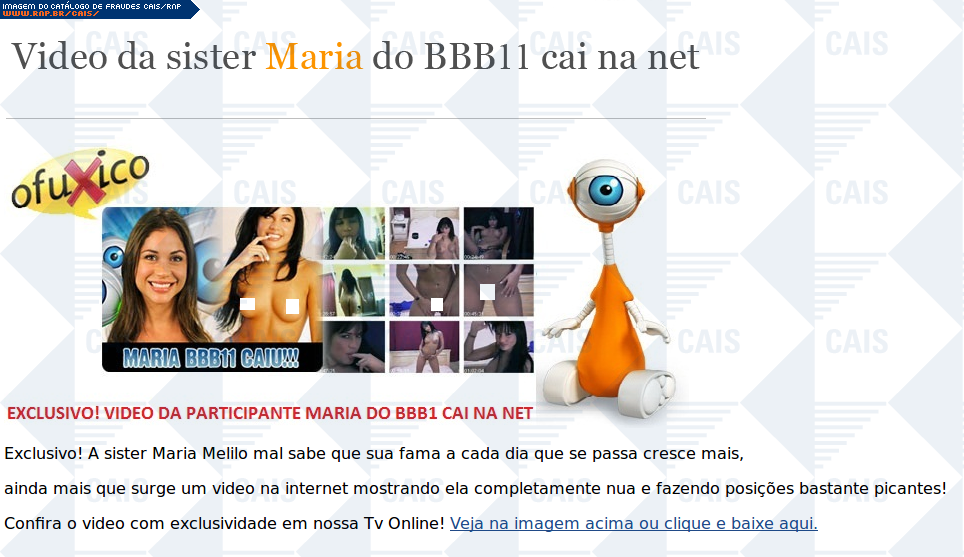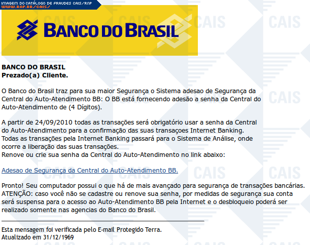 Esta página tem função informativa e educativa. Exibe uma coleção de imagens de phishing scam (fraudes eletrônicas) ou malware (código malicioso) veiculados por meio de spam (e-mail não-solicitado). Trata-se de conteúdo exemplificativo, não exaustivo, uma vez que não é possível contemplar todos os casos de fraudes existentes. Assim, caso você tenha conhecimento de um exemplar que não esteja aqui presente, isto não significa que não seja válido ou real. Inclusive incentivamos que você o envie para análise do CAIS para que, se for o caso, passe a integrar o nosso acervo.