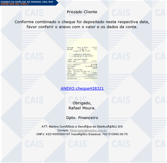 | comentário | Mensagem falsa que conteria em anexo o comprovante do depósito de um cheque. A mensagem contém a miniatura da imagem do suposto comprovante de depósito proveniente do banco do Brasil e um link para um código malicioso identificado como Trojan-Downloader.Win32.Banload.bhmk... (leia mais) | |