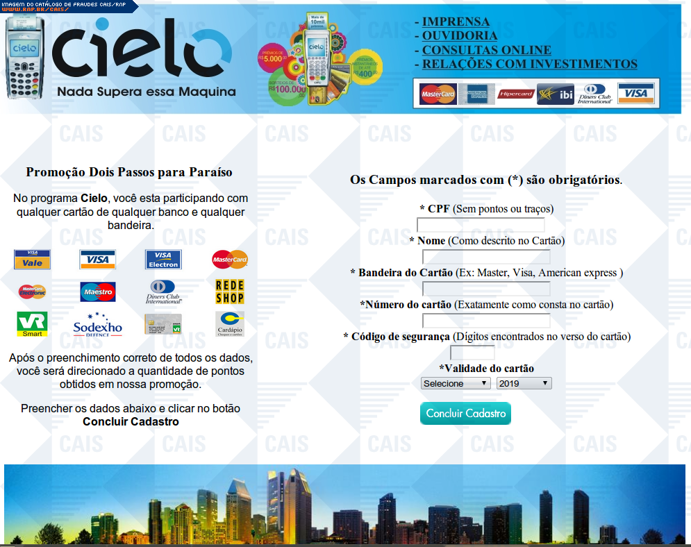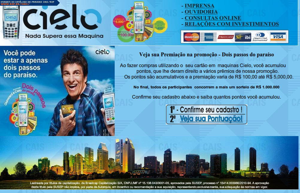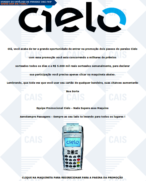 | comentário | Fraude que mostra uma promoção onde de cartão de crédito relacionada à máquina Cielo. A suposta promoção pede que o usuário clique em uma foto da máquina. O link leva a um site falso onde o usuário deve inserir os dados do cartão de crédito. Essa fraude tem... (leia mais) | |