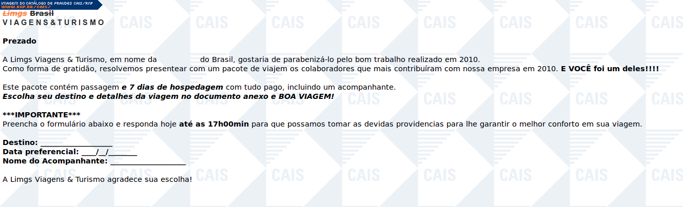 | comentário | Fraude usando o nome de uma empresa real (não citaremos o nome) e aplicada aos funcionários da empresa onde é informado que a vítima foi comtemplada com uma viagem de 7 dias por bom trabalho realizado no ano de 2010. A suposta viagem será realizada no período... (leia mais) | |