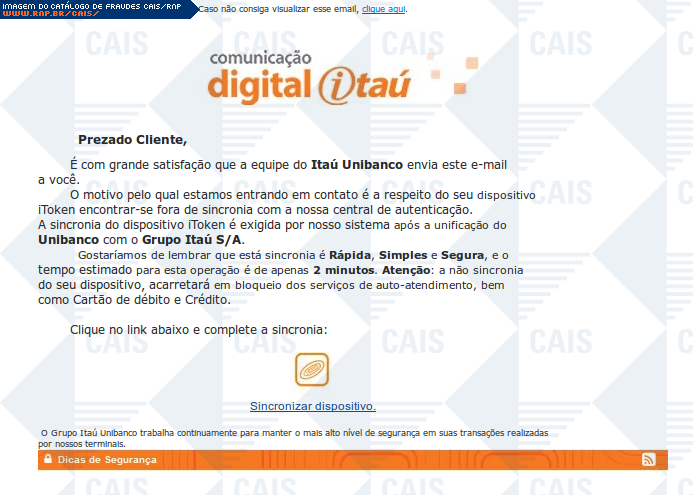 | comentário | Fraude que alega que o disposito iToken da vítima não está sincronizado com uma suposta central de autenticação. A desculpa da sincronia é que o Unibando e o Itaú se unificaram. Essa alegação é fortalecidade pelo From (De) do e-mail: Itau Unibando. A fraude... (leia mais) | |