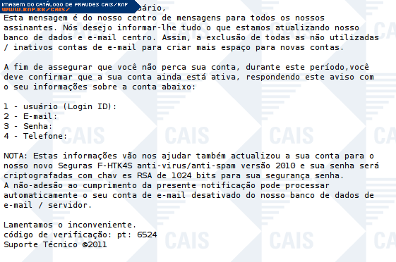 | comentário | Fraude que informa à vítima que ela deve atualizar e confirmar sua conta de e-mail inserindo dados como: usuário, e-mail, senha e telefone. A fraude tenta roubar os dados de e-mail e senha da vítima. É importante ressaltar que a mensagem contêm alguns erros... (leia mais) | |
