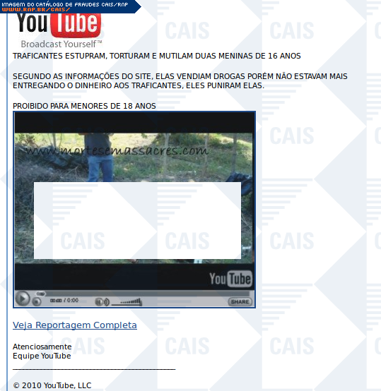 | comentário | Mensagem relatando que traficantes estupram e mutilam duas meninas de 16 anos. A fraude possui uma foto com um suposto link do vídeo. O link direciona para um código malicioso idenficiado como: W32/Obfuscated.N!genr (Norman). | |