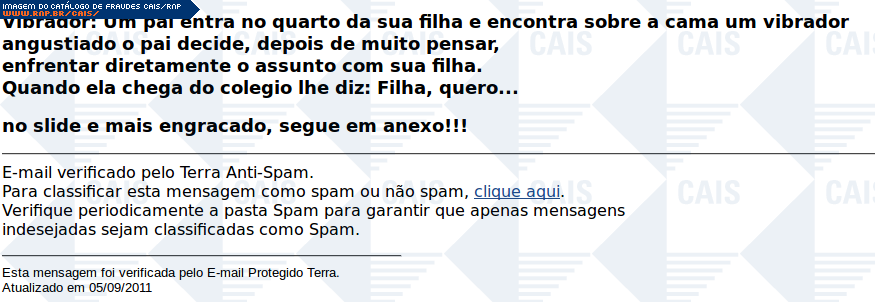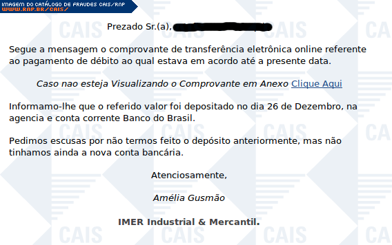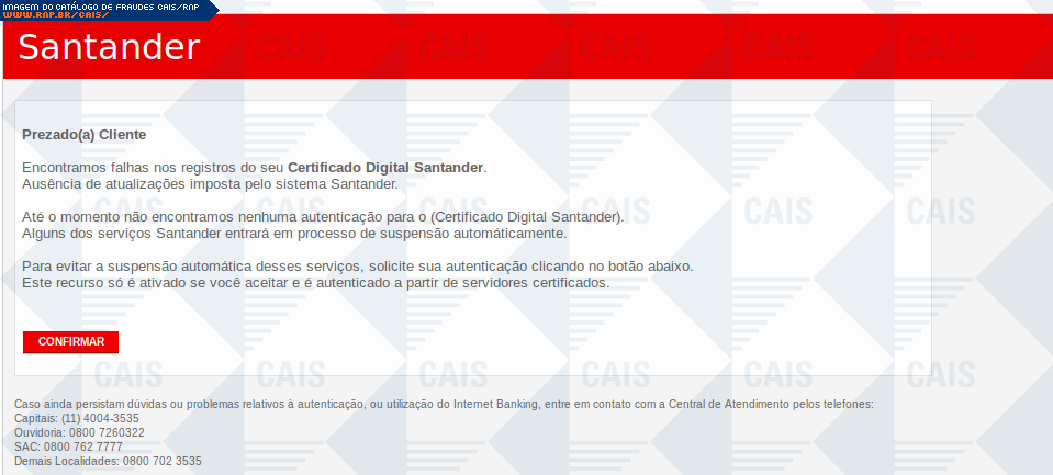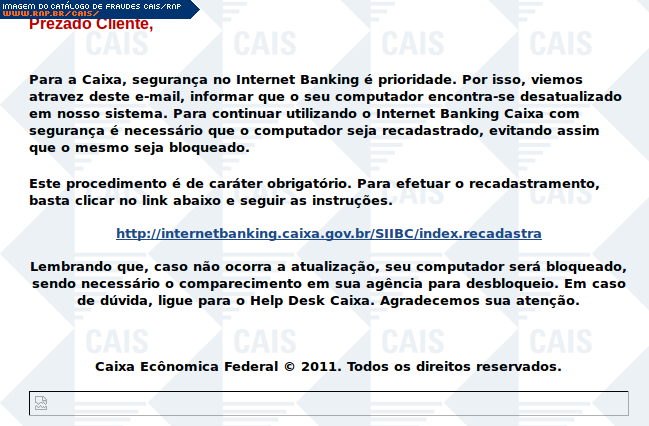 Esta página tem função informativa e educativa. Exibe uma coleção de imagens de phishing scam (fraudes eletrônicas) ou malware (código malicioso) veiculados por meio de spam (e-mail não-solicitado). Trata-se de conteúdo exemplificativo, não exaustivo, uma vez que não é possível contemplar todos os casos de fraudes existentes. Assim, caso você tenha conhecimento de um exemplar que não esteja aqui presente, isto não significa que não seja válido ou real. Inclusive incentivamos que você o envie para análise do CAIS para que, se for o caso, passe a integrar o nosso acervo.