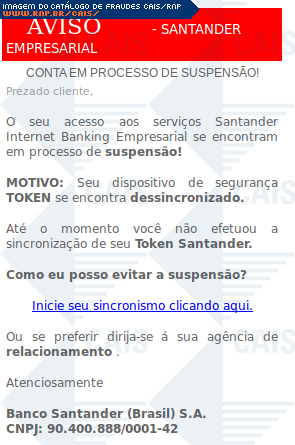 | comentário | Falsa mensagem em nome do santander ameaça suspender a conta da vítima, caso o dispositivo token não seja sincronizado. Contudo, o link destinado a tal sincronização, não estava disponível no momento da análise. | |