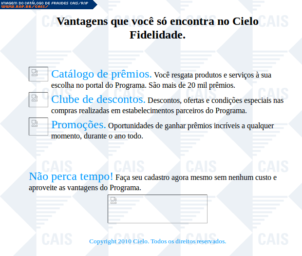 | comentário | Falsa mensagem em nome da Cielo oferece cadastro em promoção para concorrer a mais de 20 mil prêmios. Há um link para tal cadastro, contudo este não apontava para uma paǵina válida no momento da análise. | |