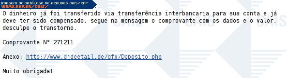 | comentário | Fraude comunica à vítima sobre a realização de um depósito supostamente esperado. Porém o link para visualizaçaõ do depósito não apontava para um endereço válido. | |