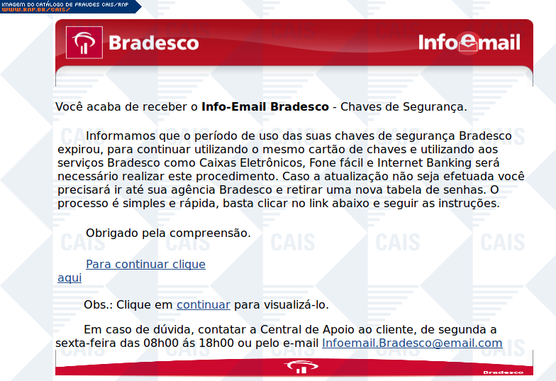 | comentário | Falsa mensagem em nome do banco do Bradesco informa à vítima de que a sua chave de segurança expirou e portanto, é necessária uma atualização. Há um link para visualizar instruções para tal atualização, porém o link não apontava para ua página válida, no... (leia mais) | |