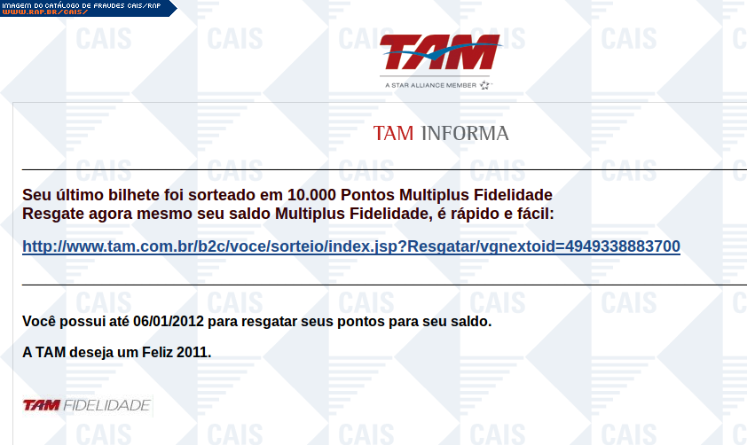 | comentário | Fraude se passa por uma legítima promoção da TAM e informa à vítima de que esta foi contemplada com 10.000 pontos multiplus fidelidade. Porém o link disponível para resgate de tais pontos, não apontava para uma página válida, no momento da análise. | |