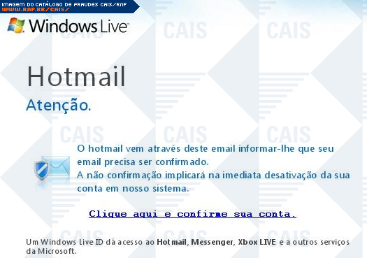 | comentário | Falsa mensagem em nome do hotmail solcita confirmação de conta. Porém o link destinado a tal confirmação não direcionava a um endereço válido. | |