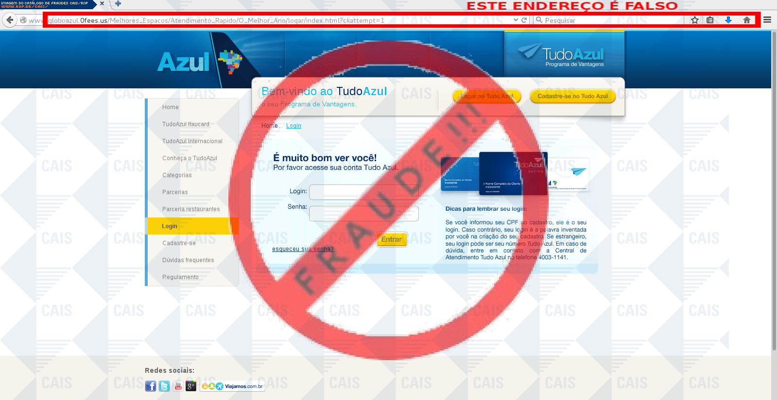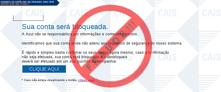 | comentário | A vítima recebe uma mensagem dizendo que sua conta da Azul não aderiu aos requisitos de segurança do sistema e que deve confirmar seus dados através de um link. Contudo, o link leva a uma página falsa que tenta roubar informações de login da vítima. | |