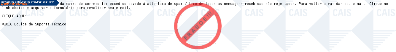 | comentário | A vítima recebe uma mensagem dizendo que seu limite de armazenamento da caixa de correio foi excedido devido à alta taxa de spam e que deve revalidar seu endereço de email a partir de um link passado na mensagem. Porém, o link leva a uma página falsa que... (leia mais) | |