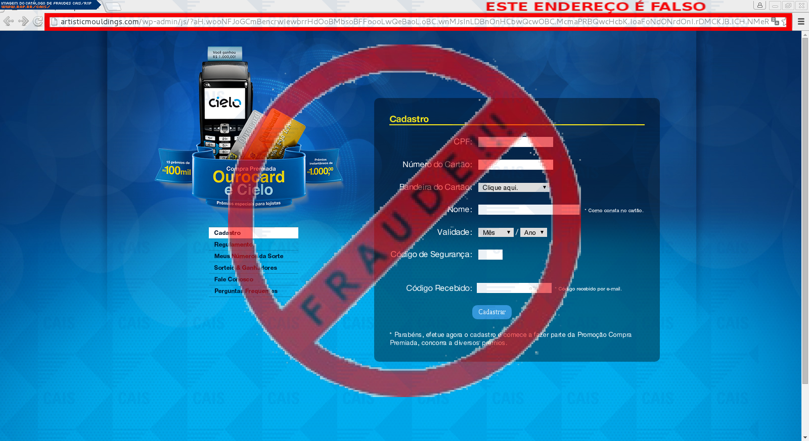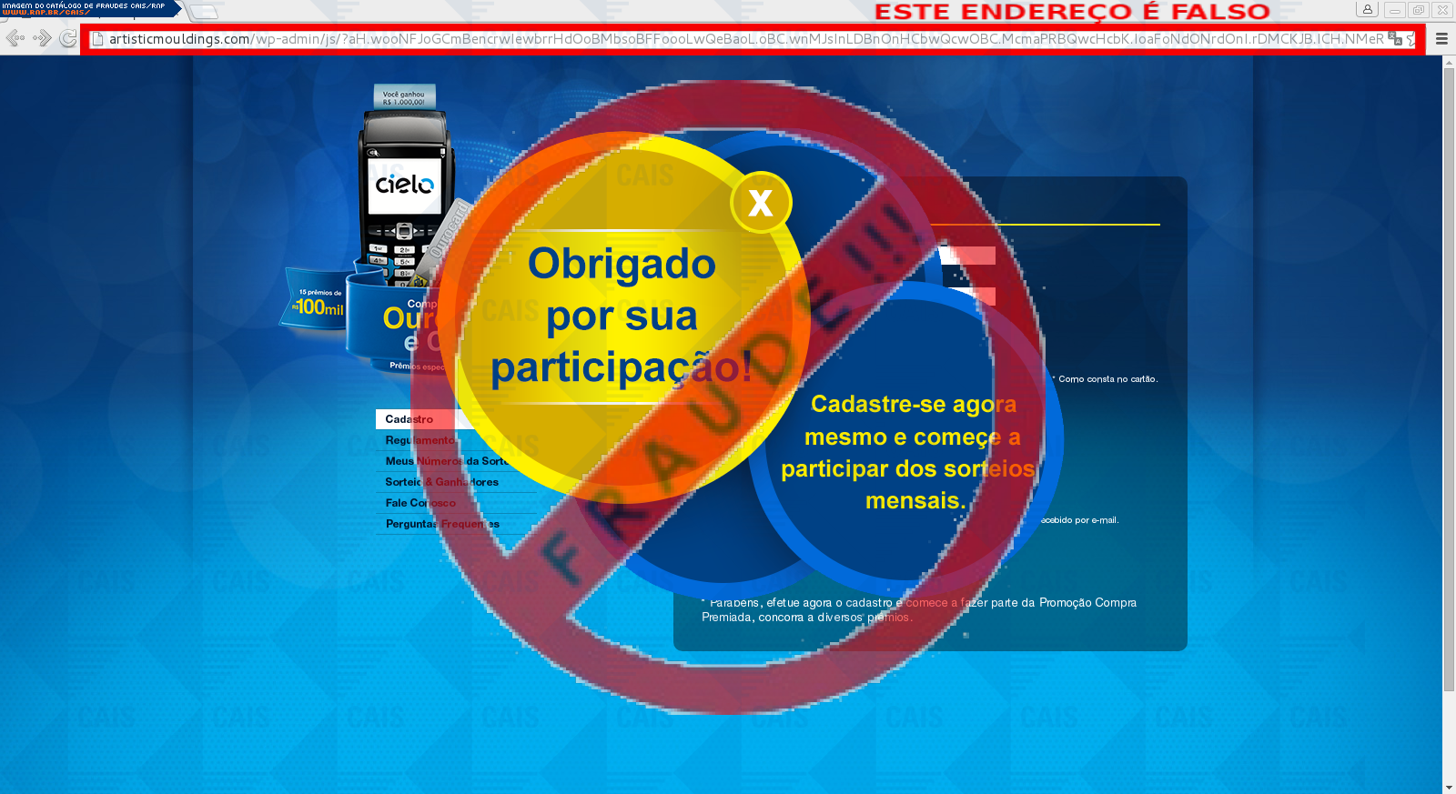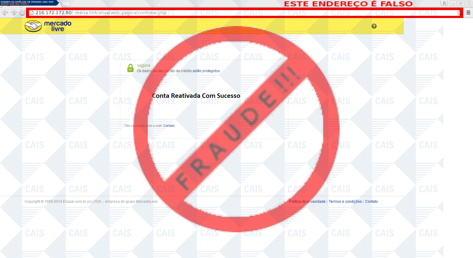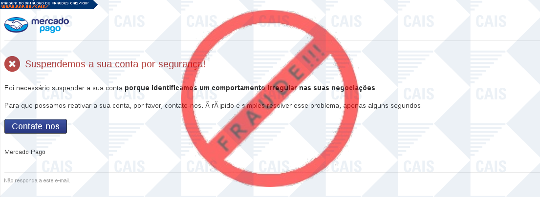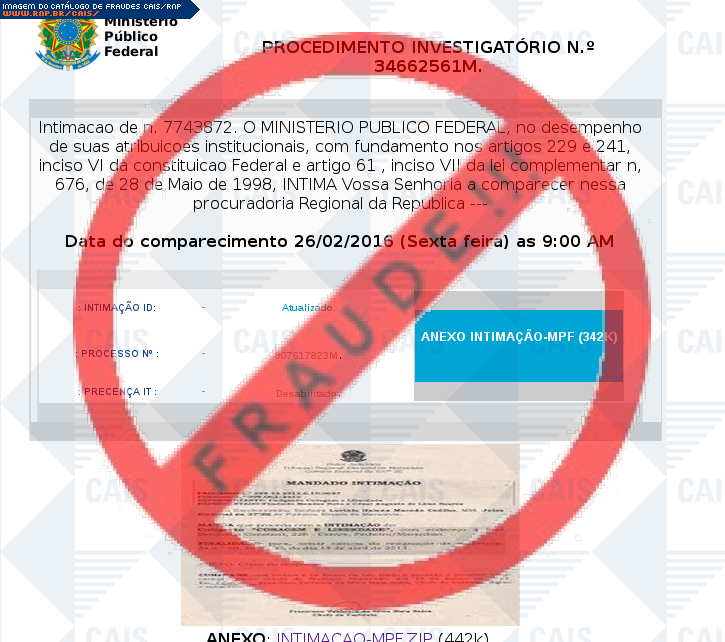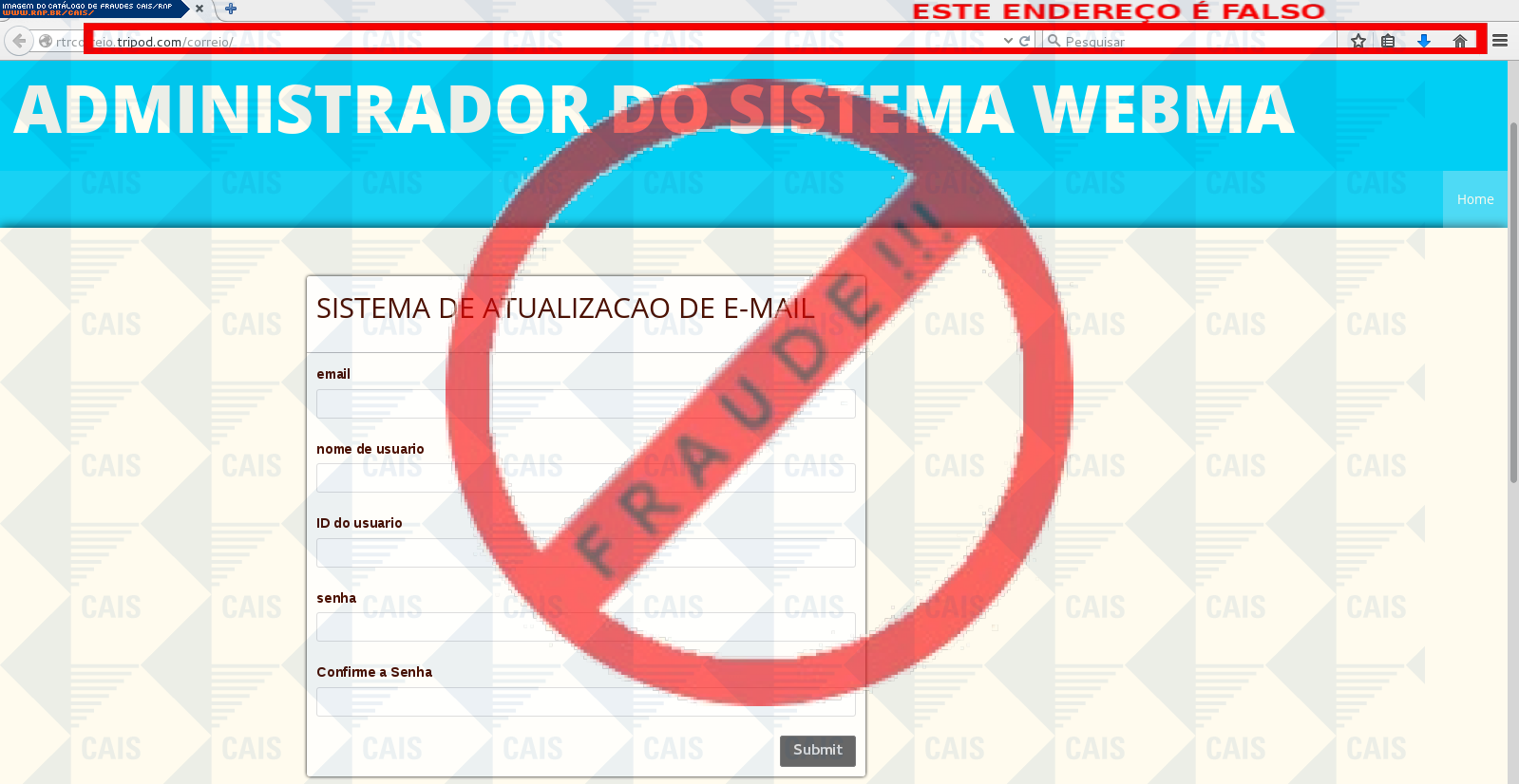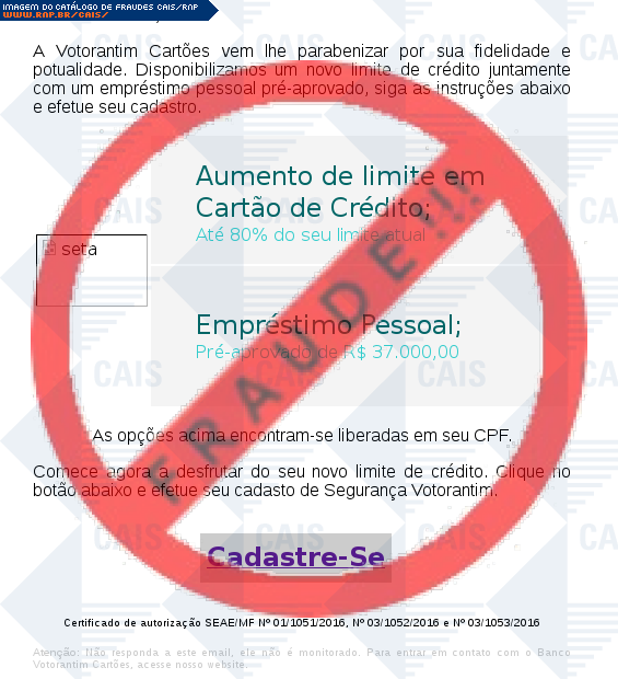 Esta página tem função informativa e educativa. Exibe uma coleção de imagens de phishing scam (fraudes eletrônicas) ou malware (código malicioso) veiculados por meio de spam (e-mail não-solicitado). Trata-se de conteúdo exemplificativo, não exaustivo, uma vez que não é possível contemplar todos os casos de fraudes existentes. Assim, caso você tenha conhecimento de um exemplar que não esteja aqui presente, isto não significa que não seja válido ou real. Inclusive incentivamos que você o envie para análise do CAIS para que, se for o caso, passe a integrar o nosso acervo.