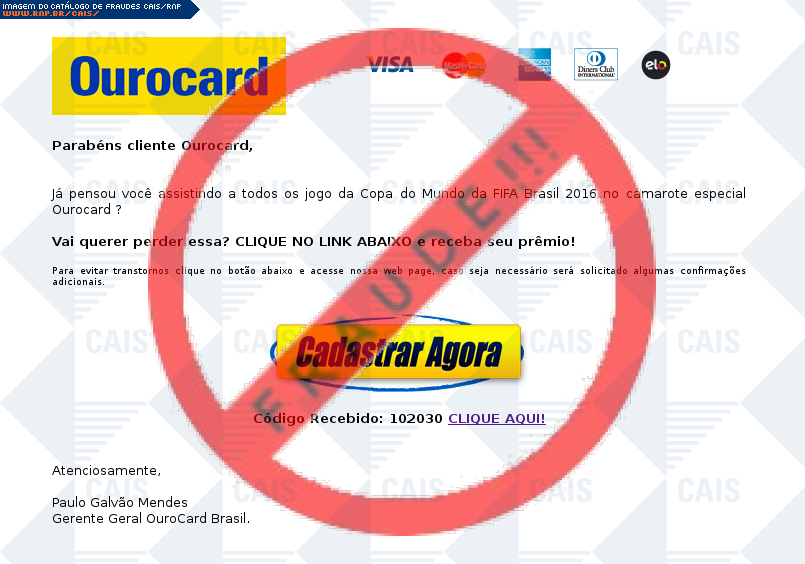 | comentário | A vítima recebe um e-mail informando sobre as vantagens de uma promoção relacionada ao Ourocard sendo o cadastro através do link disponibilizado, no entanto a página é falsa criada para roubar informações do usuário. | |