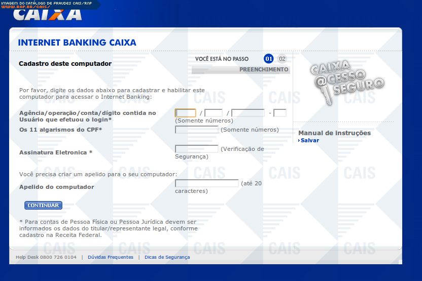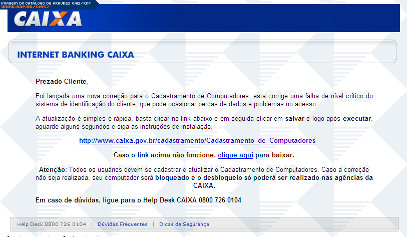 | comentário | A mensagem, em nome da Caixa, a vítima deve atualizar seu plugin de segurança para a correção de falhas do cadastramento de computadores. O link leva leva a uma página falsa, destinada a coletar dados da conta bancária da vítima. | |