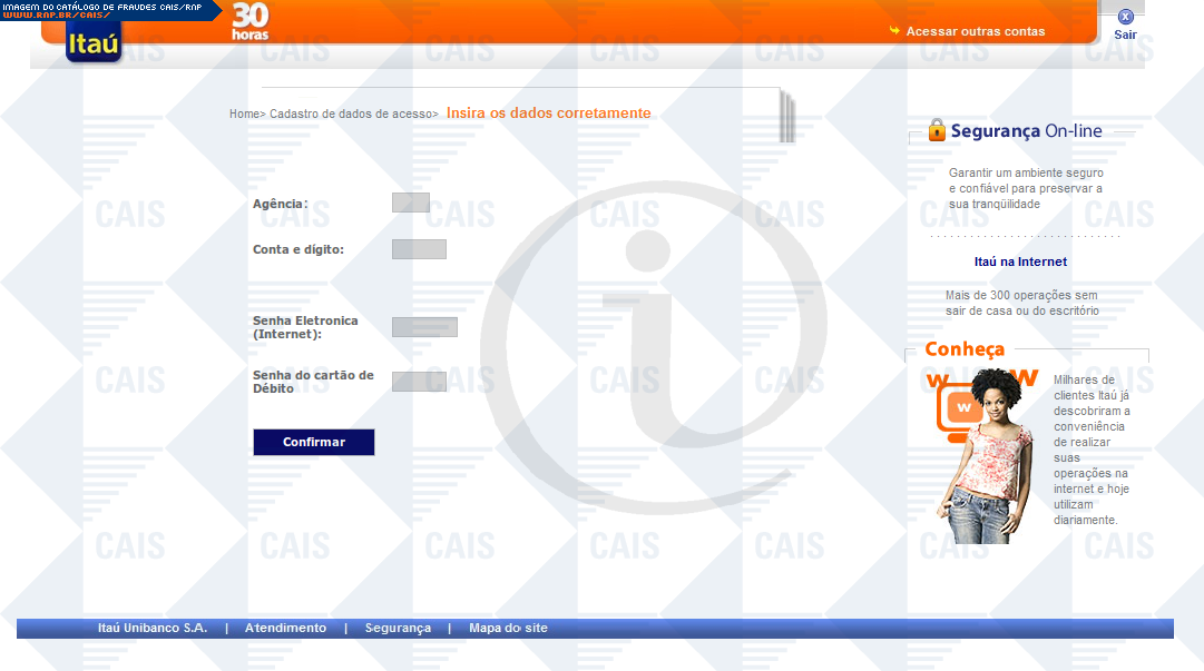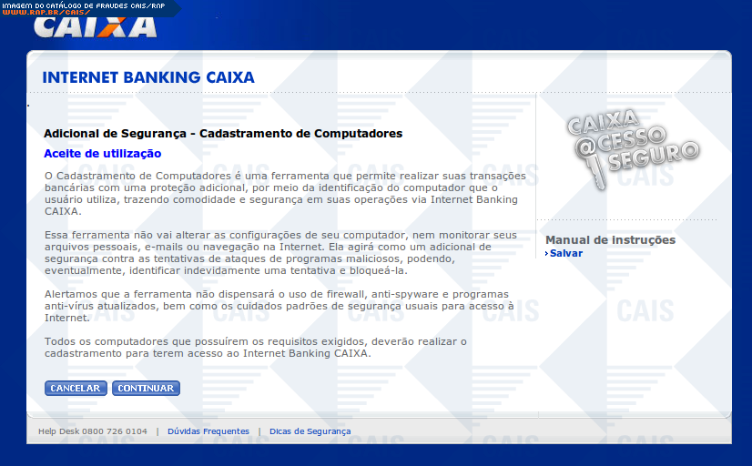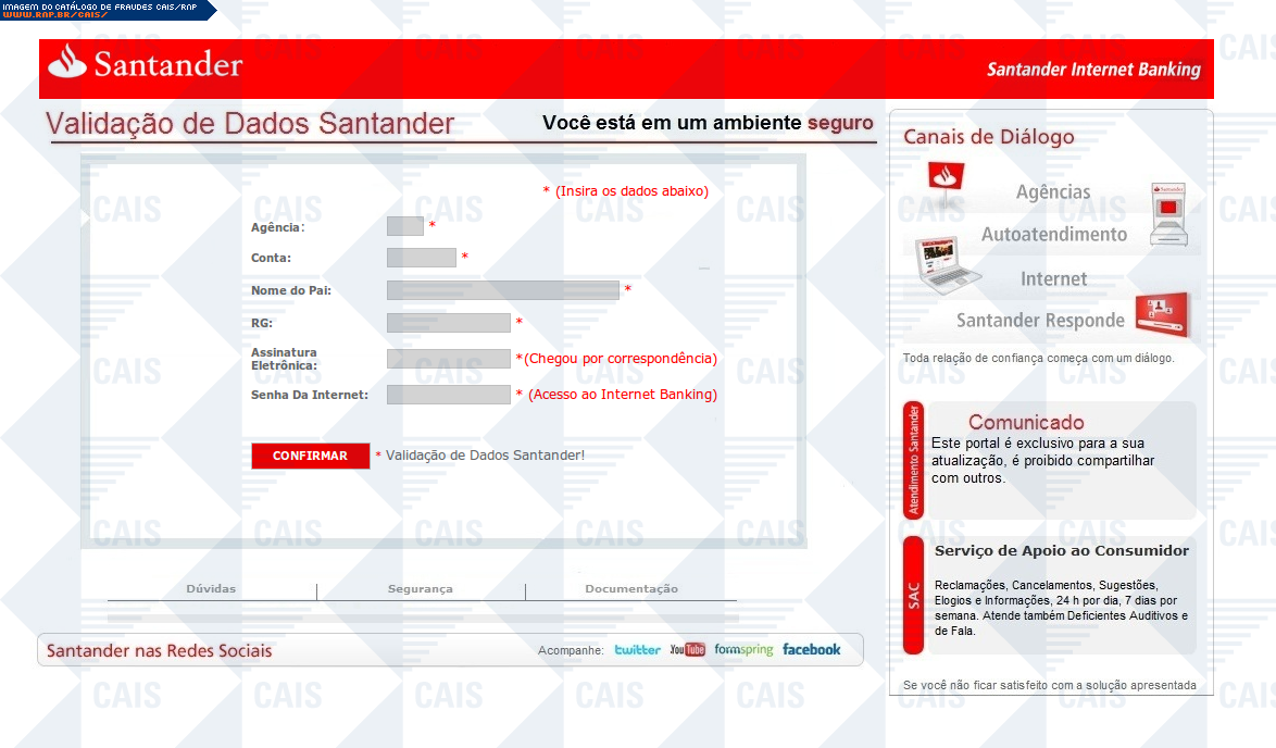 Esta página tem função informativa e educativa. Exibe uma coleção de imagens de phishing scam (fraudes eletrônicas) ou malware (código malicioso) veiculados por meio de spam (e-mail não-solicitado). Trata-se de conteúdo exemplificativo, não exaustivo, uma vez que não é possível contemplar todos os casos de fraudes existentes. Assim, caso você tenha conhecimento de um exemplar que não esteja aqui presente, isto não significa que não seja válido ou real. Inclusive incentivamos que você o envie para análise do CAIS para que, se for o caso, passe a integrar o nosso acervo.