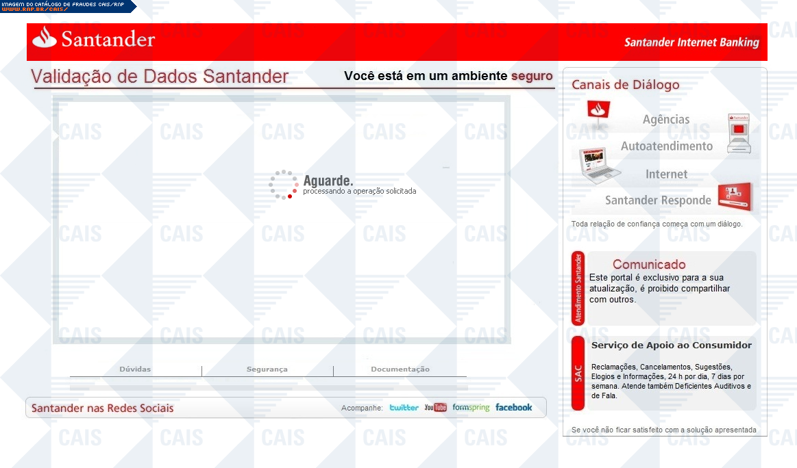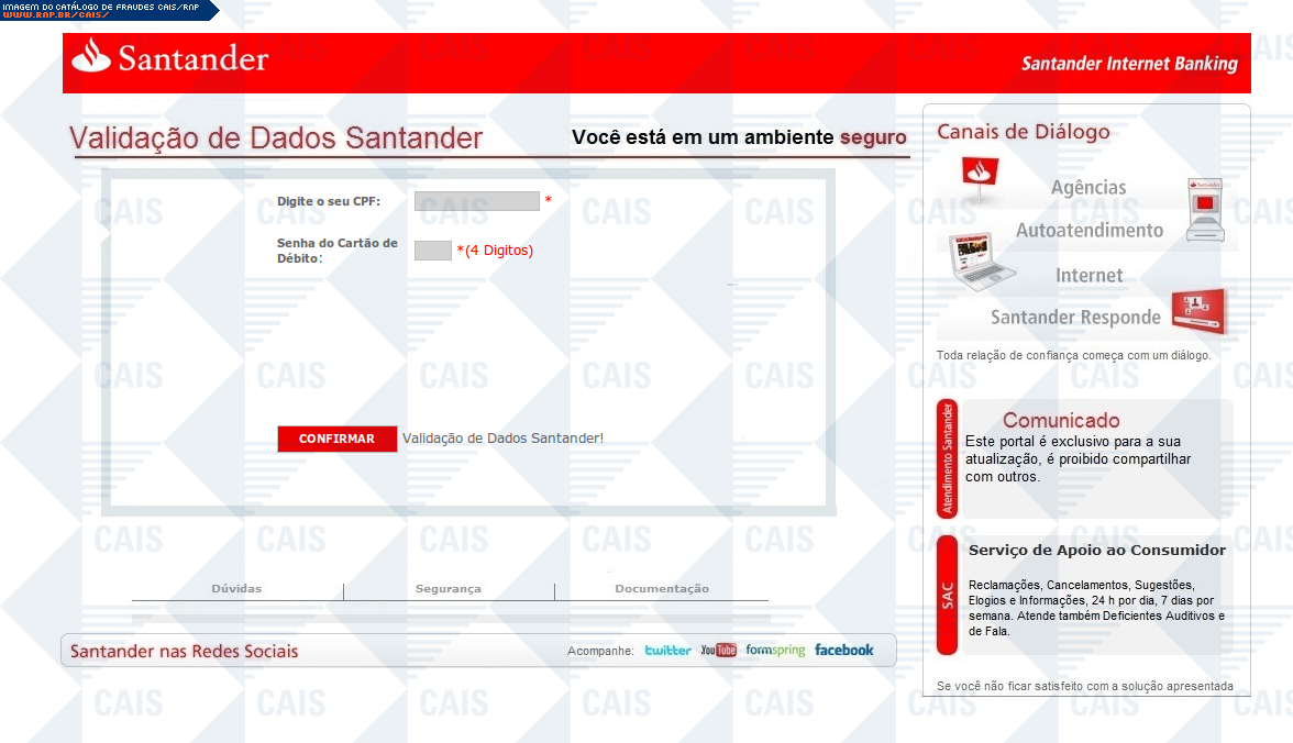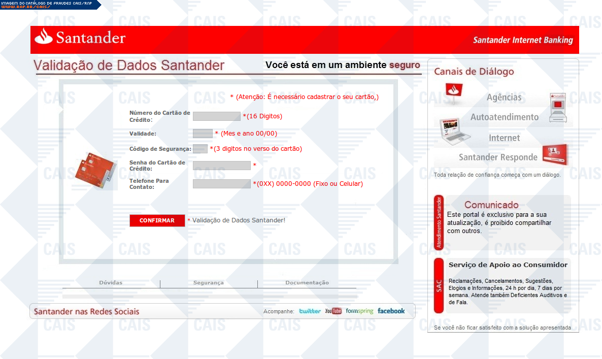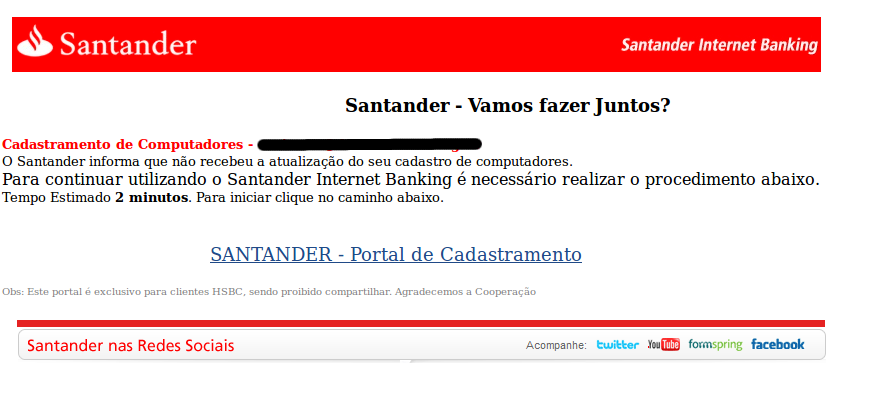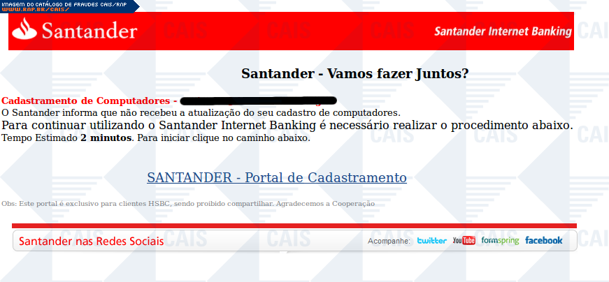 | comentário | A mensagem, em nome do banco Santander, informa que a vítima deve realizar a atualização do cadastramento de computadores. O link leva a um site falso, destinado a coletar dados da conta bancária e do cartão de crédito da vítima. | |